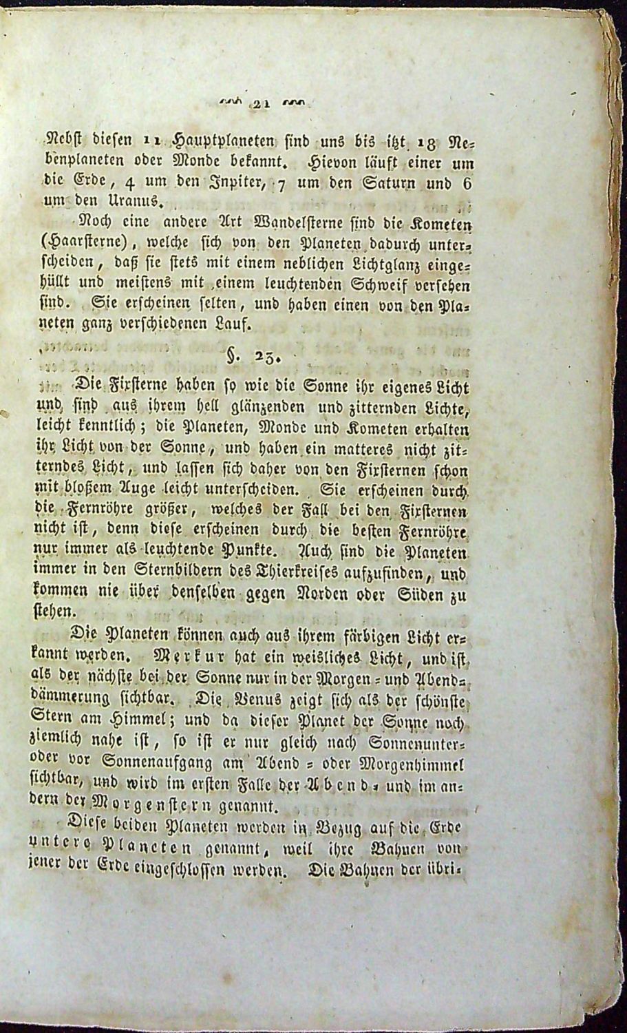 Tištěno švabachem, arabská paginace stran uprostřed horního okraje mezi mizícími vlnovkami. <br>Dobová obálka z tragantového papíru, ve hřbetu potrhaná a v horní jeho části pap. pokryv chybí, n a přední straně obálky při vnitřním horním okraji pap. štítek, knižní blok neoříznutý, papír místy zahnědlý a při vějším okraji lehce roztřepený.<br>Josef Jüttner (12.9. 1775 Bernartice - 27.4. 1848 Praha) kartograf, generálmajor rakousko-uherské armády. Autor prvního plánu Prahy vytvořeného na geodetickém základu, který se stal též podkladem pro Langweilův model Prahy.