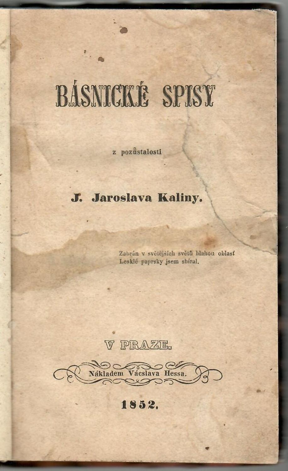 Antikva, tištěné poznámky pod čarou, arabská paginace stran uprostřed horního kraje mezi tiskařskými ozdůbkami. Za titulním listem tištěná dedikace hraběnce Eleonoře Kounicové a hraběnce Antonii Daunové od bratra zesnulého básníka Karla Kaliny. Od strany 201 do konce tištěné vysvětlení - slovníček, Kalinových novotvarů a archaismů. V úvodu životopis básníkův a vysvětlení důvodů jež vedly k vydání básní z jeho pozůstalosti pány Fr. D. (František Doucha) a J. V.(Jan Křtitel Vlček).<br>Kartonové desky potažené mramorovaným papírem s plátěným hřbetem, stříkané ořízky. Vazba ohmataná a místy lehce odřená, naražené rohy. Titulní list zahnědlý a vyspravený podlepením, papír zahnědlý, místy hnědé skvrnky a skvrny způsobené kyselostí papíru. <br>Josef Jaroslav Kalina (9.11. 1816 Haida, Nový Bor - 22.6. 1847 Praha), básník, literární a přírodní vědec, filosof, obrozenec a filolog (krom slovanských jazyků, studoval i hebrejštinu, překládal z němčiny a angličtiny). Mezi jeho přátele patřili Karel Slavoj Amerling se kterým se podíleli na projektu školy Budeč a Josef Václav Frič. Proslul svým bohémským životem, jeden čas bydlel v sudu vystlaném senem na Karlově náměstí, kvůli jeho nezměrnému pití se nakonec od něj odvrátily obě mecenášky, kterým básníkův bratr knihu dedikoval.
