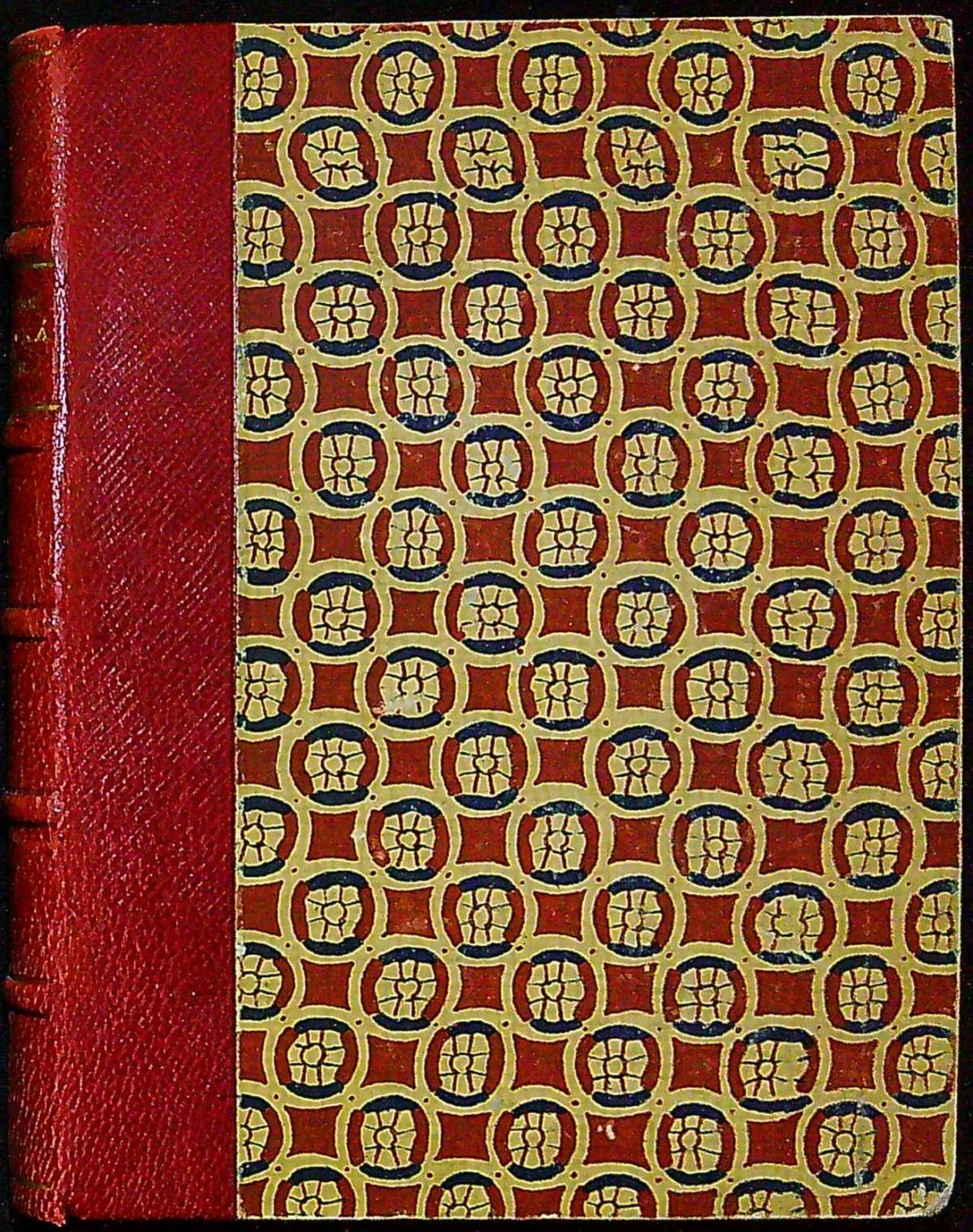 Kartonové desky potažené olejovým papírem, temně červený z hlazené vepřovice, ve hřbetu 5 vazů, ve druhém poli tlačený a zlacený název, zlacená svrchní ořízka, na patitulu staré razítko "Knihkupectví Josef Springer v Praze".