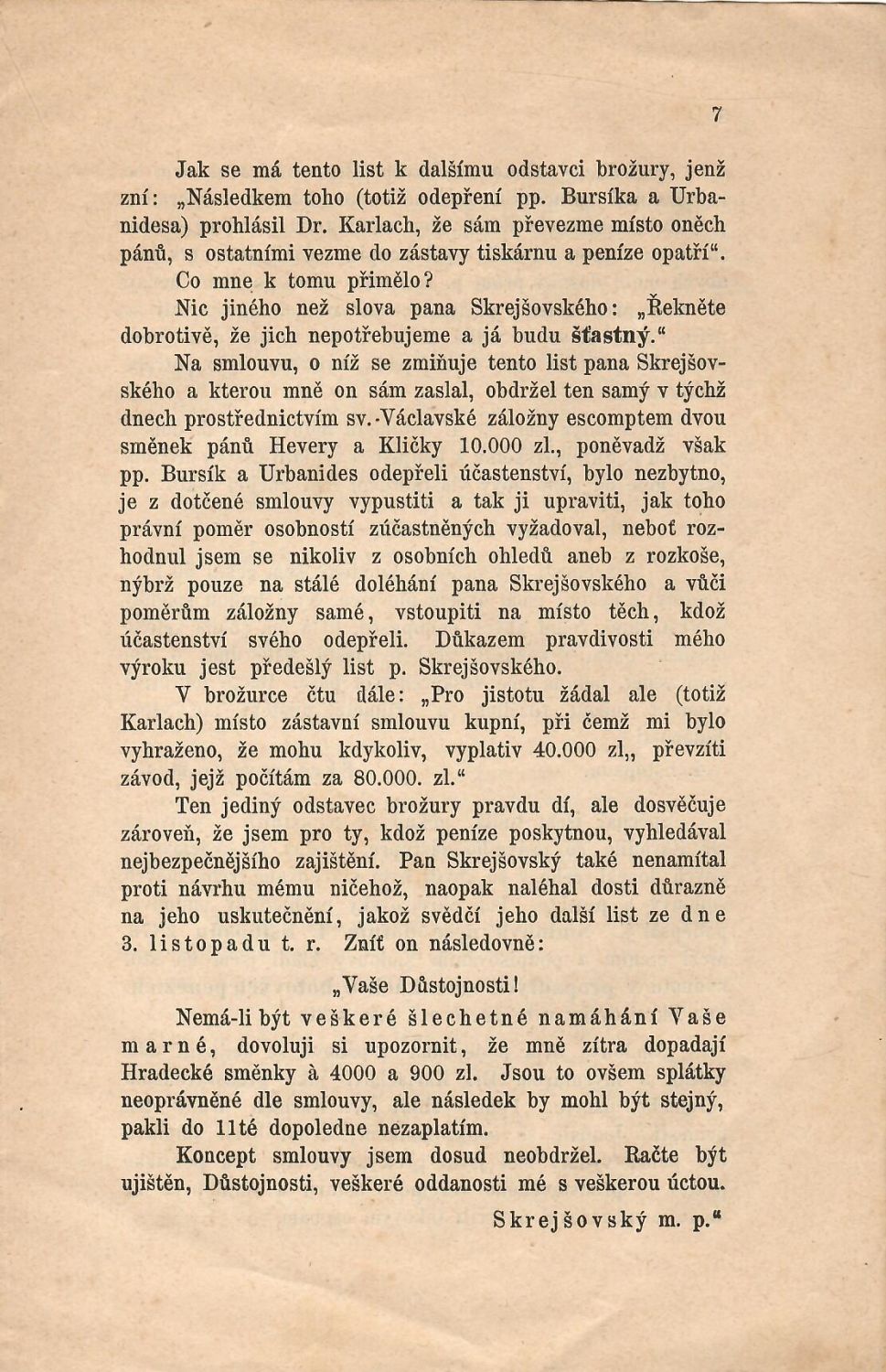 Původní brožurka, ve které M. Karlach, katolický kněz, politik a ředitel později zkrachovalé Svatováclavské záložny odpovídá na výhrady Jana Stanislava Skrejšovského, novináře a politika, člena Staročeské strany, ohledně jeho působení a nakládání s finančními prostředky ve Svatováclavské záložně. O rok později vyšel ještě druhý sešitek.