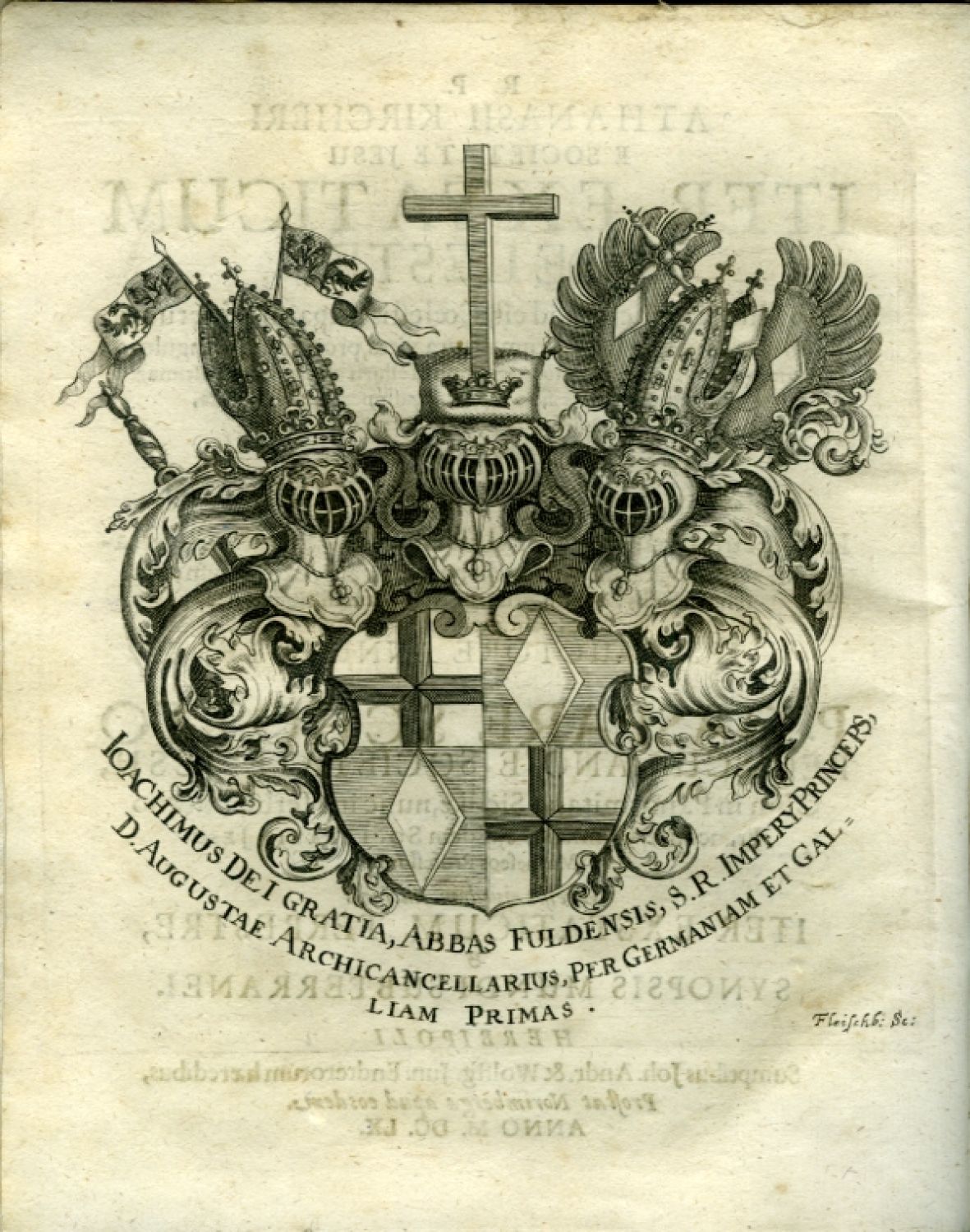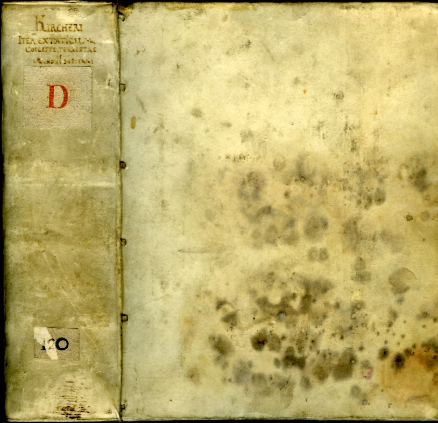 Na hřbetě ruokpis. titul a 2 knihovnické štítky; na před. desce tmavé skvrny, zadní odřená, rytý tit. list ohmataný, jinak listy čisté; na s. 285/6 drobná perforace. – Druhé vydání obou známých utopistických, kosmologicko-astrologických spisů (poprvé vydány v Římě zvlášť r. 1656 a 1657), jež okomentoval a vydal jako souborné vydání würzburgský matematik, Kircherův žák a blízký spolupracovník Kaspar Schott (1608-1666). – A. Kircher (1602-1680), německý jezuita, studoval na různých kolejích a universitách v Německu a Francii, od r. 1633 vyučoval v Římě, kde také zemřel. Jako jeden z posledních všestranných učenců 17. stol. byl literárně velmi činný, za svého života publikoval 44 často objemných a bohatě ilustrovaných foliantů o magnetismu, optice, akustice, hudební teorii, matematice, astronomii, geo-, hydro-, vulkano- a mineralogii, egyptských dějinách, také však o arše Noemově či stavbě Babylonské věže. - VD17 232925752; Caillet 5775; Dunnhaupt 12.12.