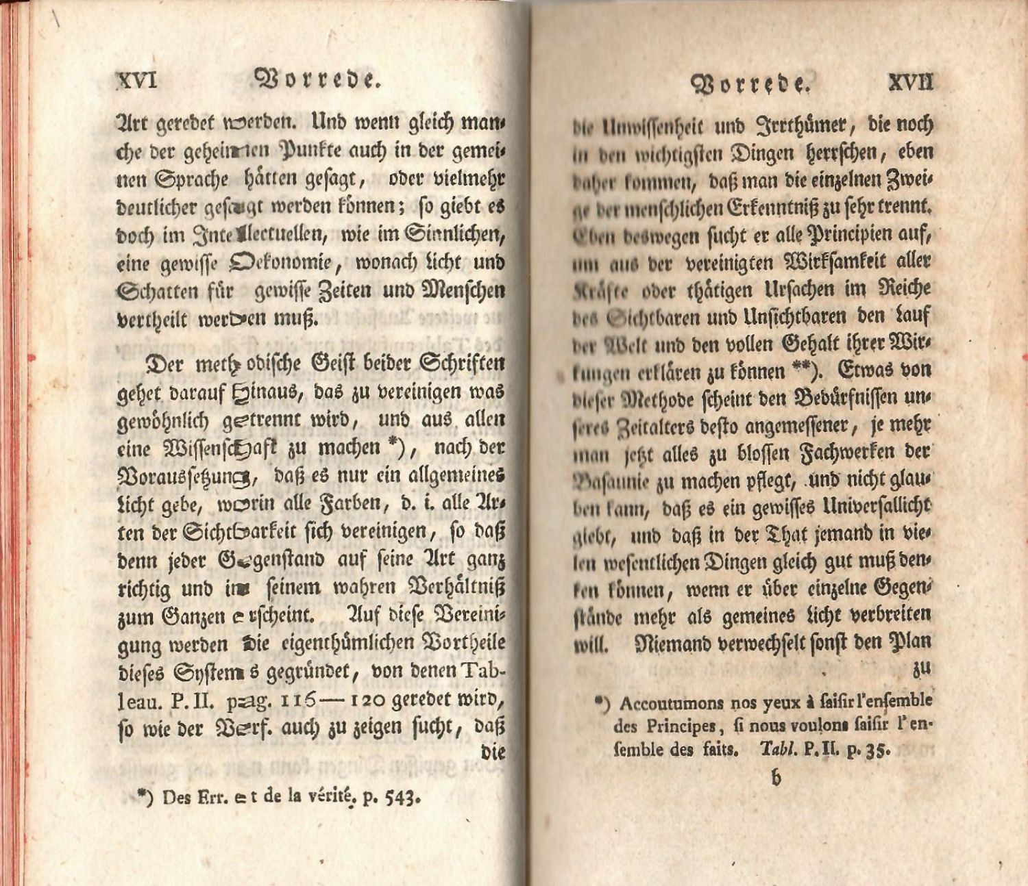 Wolfstieg 8722; Holzmann-Bohatta II,3430<br>Tištěno švabachem, francouzský text a latinská slova antikvou, řecký text alfabetou, tištěné poznámky pod čarou. Na straně 235 titulní list druhého dílu, průběžně paginováno. Vstupní dřevorytový vlys, koncové viněty. <br>Dobová vazba s kartonovými deskami potaženými olejovým papírem, kožený hřbet a nárožnice, ve hřbetu 5 vazů, ve druhém poli původní vínově červený kožený štítek s tlačeným a zlaceným názvem, v poli třetím zelený s dokončením názvu, v ostatních polích tlačený a zlacený rostlinný ornament, červeně barvené ořízky, na přídeštích dobový škrobový papír s ornamentem. Na přední předsádce razítko jednoho z předchozích vlastníků "Ján Bohuš advokát v Brezne", nad ním a na zadní předsádce podpis tužkou posledního vlastníka, grafika Jiřího Šalamouna z jehož knihovny byla kniha zakoupena. Vazba místy lehce ohmataná. <br>Johann Friedrich Kleuker (24.10. 1479 Osterode - 1.6. 1827 Kiel) německý protestantský teolog a universitní profesor, přítel J. G. Herdera, od roku 1798 profesor teologie na universitě v Kielu.