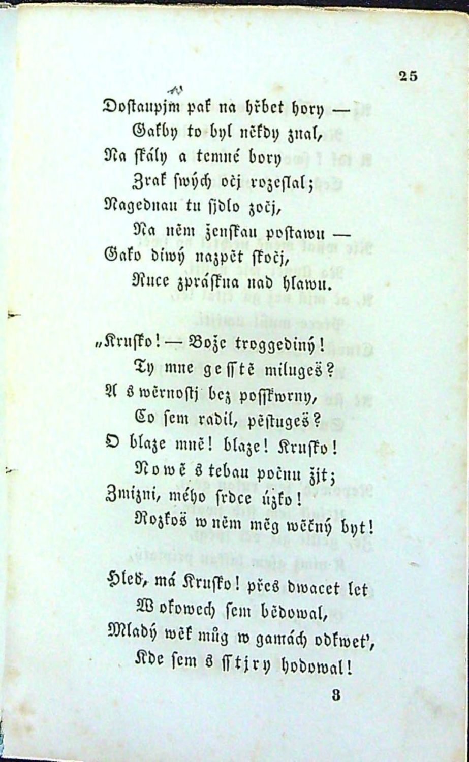 Tištěno švabachem. - Původní pap. obálka, papírový pokryv ve hřbetu ve spodní polovině chybí a v horní polovině je natržený.