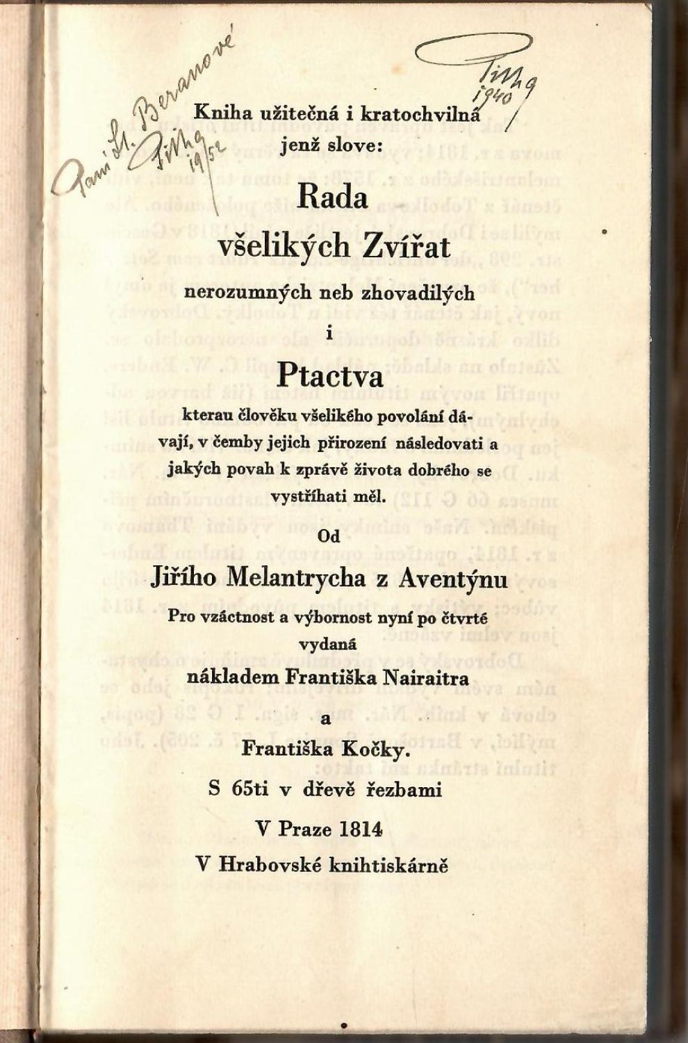Kniha vžitečná y kratochwilná, genž slowe: Rada wsselikých Zwjřat nerozumných neb zhowadilých, y Ptactwa, kterau člowěku wsselikého powplánj dáwagj, w čemby gegich přirozenj následowati, a gakých powah k zpráwě žiwota dobrého se wystřjhati měl. Od Giřjho Malantrycha z Awentýnu. Pro wzáctnost a wýbornost nynj po čwrté wydaná.