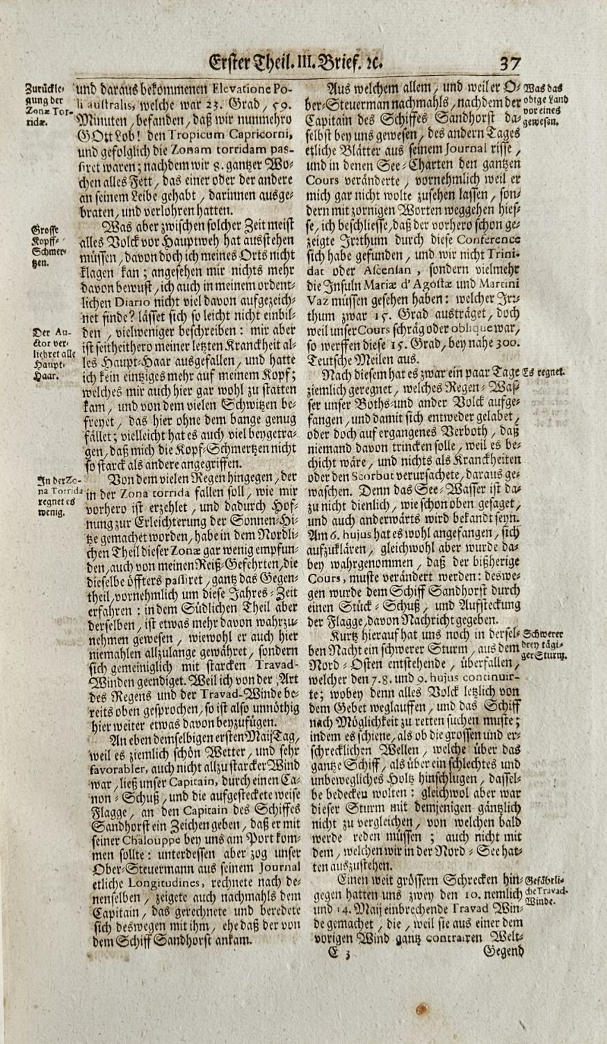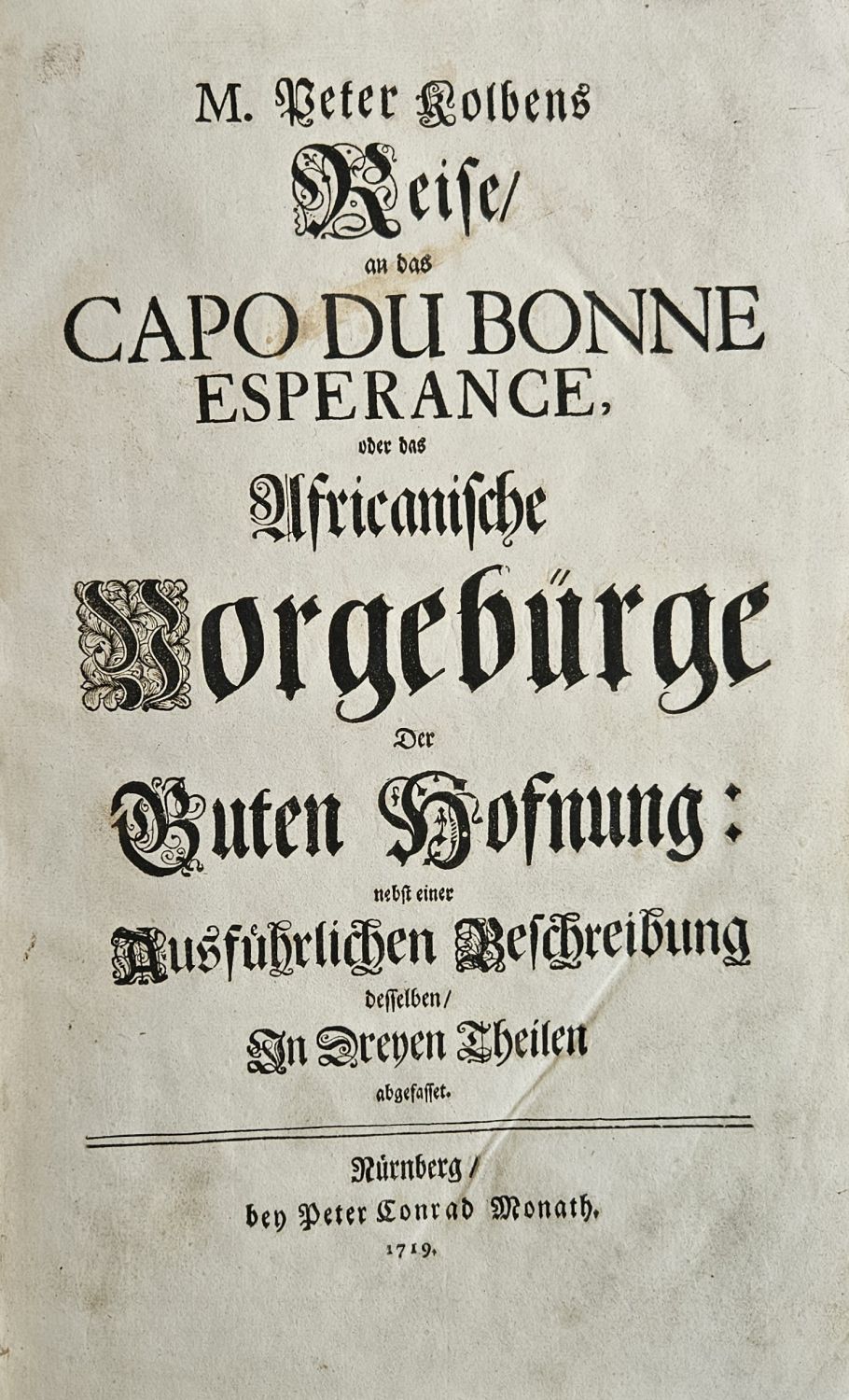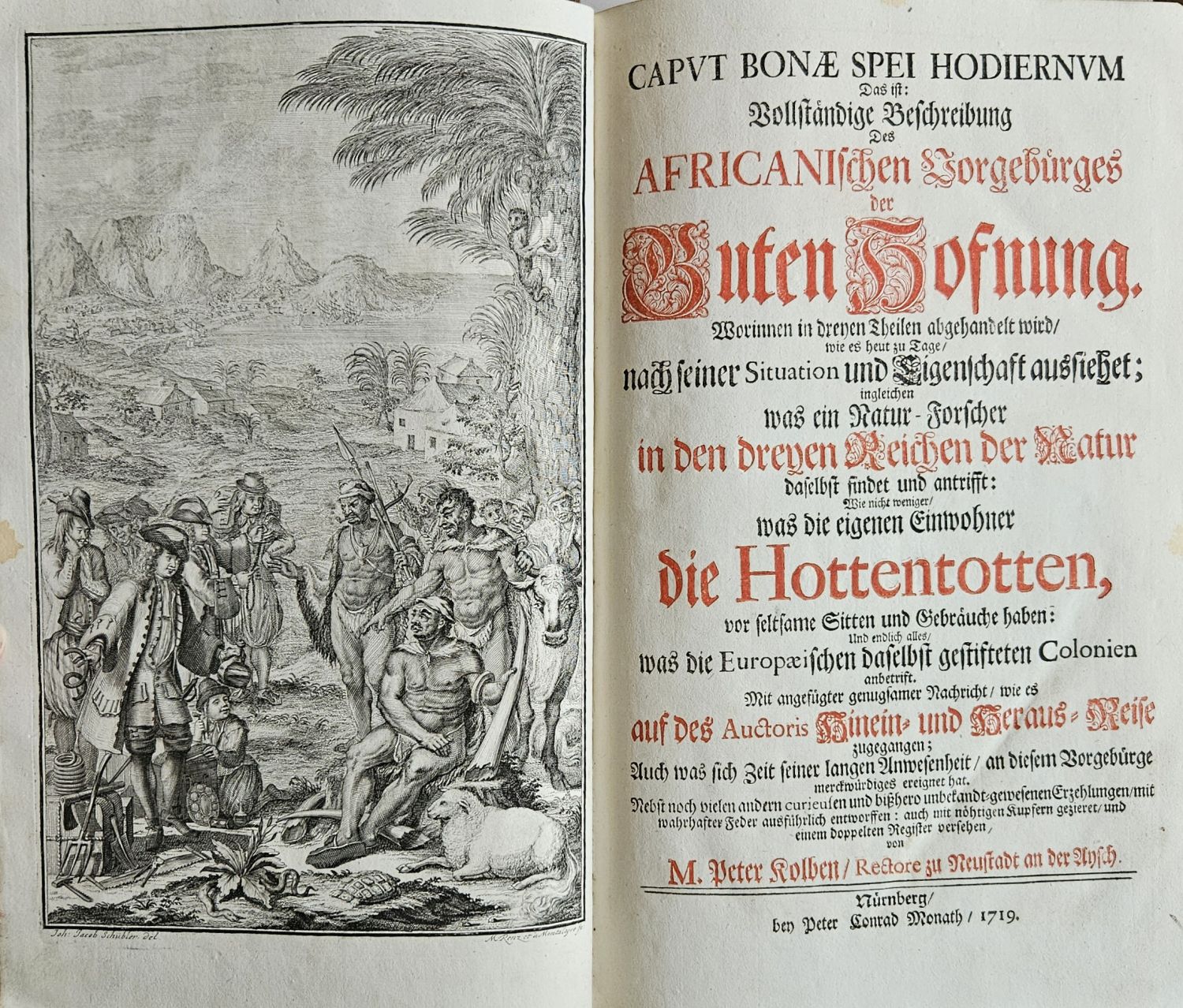 Tištěno švabachem ve dvou sloupcích, latinská slova antikvou, živá záhlaví od sazby oddělená jednoduchou linkou, tištěné poznámky po stranách, místy chybná paginace stran. Plné iniciály na rostlinném pozadí zalomené do výše 5-7 řádků, iniciály propletené úponky ve výši 5 řádků, viněty, pásové vlysy. Od strany 347 druhý díl, od strany 583 třetí díl.<br>Dobová vazba z temně hnědé hověziny, ve hřbetu 5 vazů, ve druhém poli na temném pozadí tlačený a zlacený název, barvené ořízky. Vazba ohmataná a místy lehce odřená, zlacení v názvu vybledlé, naražené rohy. Kompletní exemplář ve stavu velmi dobrém.<br>Peter Kolbe (10.10. 1675 Marktredwitz - 31.12. 1726 Neustadt an der Aisch) německý učitel, astronom, etnolog, cestovatel a průzkumník Jižní Afriky. Nabízená kniha je jeho hlavním dílem a autor v ní popisuje život a zvyky kmene Khoikhoi (hanlivě nazývaných Hotentoti), dílo se výrazně liší od předchozích děl cestovatelů, autor citlivě vnímá jejich zvyky a způsob života a také srovnává evropskou kulturu s jejich způsobem života a kulturními zvyky. V knize se autor zabývá též popisem místní fauny a flory a přírodní historií, zdokumentoval též nájezdy ozbrojených Evropanů a jejich drancování místních vesnic.