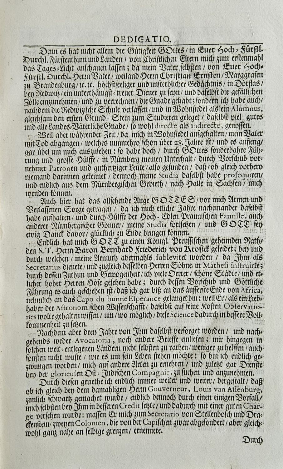 CAPVT BONAE SPEI HODIERNVM Das ist: Vollständige Beschreibung Des AFRICANIschen Vorgebürgers der Guten Hofnung. Worinnen in dreyen Theilen abgehandelt wird/ wie es heut zu Frage/ nach seiner Situation und Eigenschaft aussiehet; ingleichen was in Natur - Forscher in den dreyen Reichen der Natur daselbst findet und antrifft: Wie nicht weniger/ was die eigenen Einwohner die Hottentotten, vor seltsame Sitten und Gebräuche haben: was die Europaeischen daselbst gestifteten Colonien anbetrift. Mit angefügter genugsamer Nachricht/ wie es auf des Auctoris Hinein= und Heraus= Reise zugegangen; Auch was sich vielen andern curieusen und bißhero unbekandt=gewesenen Erzehlungen/ mit wahrhafter Feder ausführlich entworffen: auch mit nöhtigen Kupfern gezieret/ und einem doppelten Register versehen, von ....