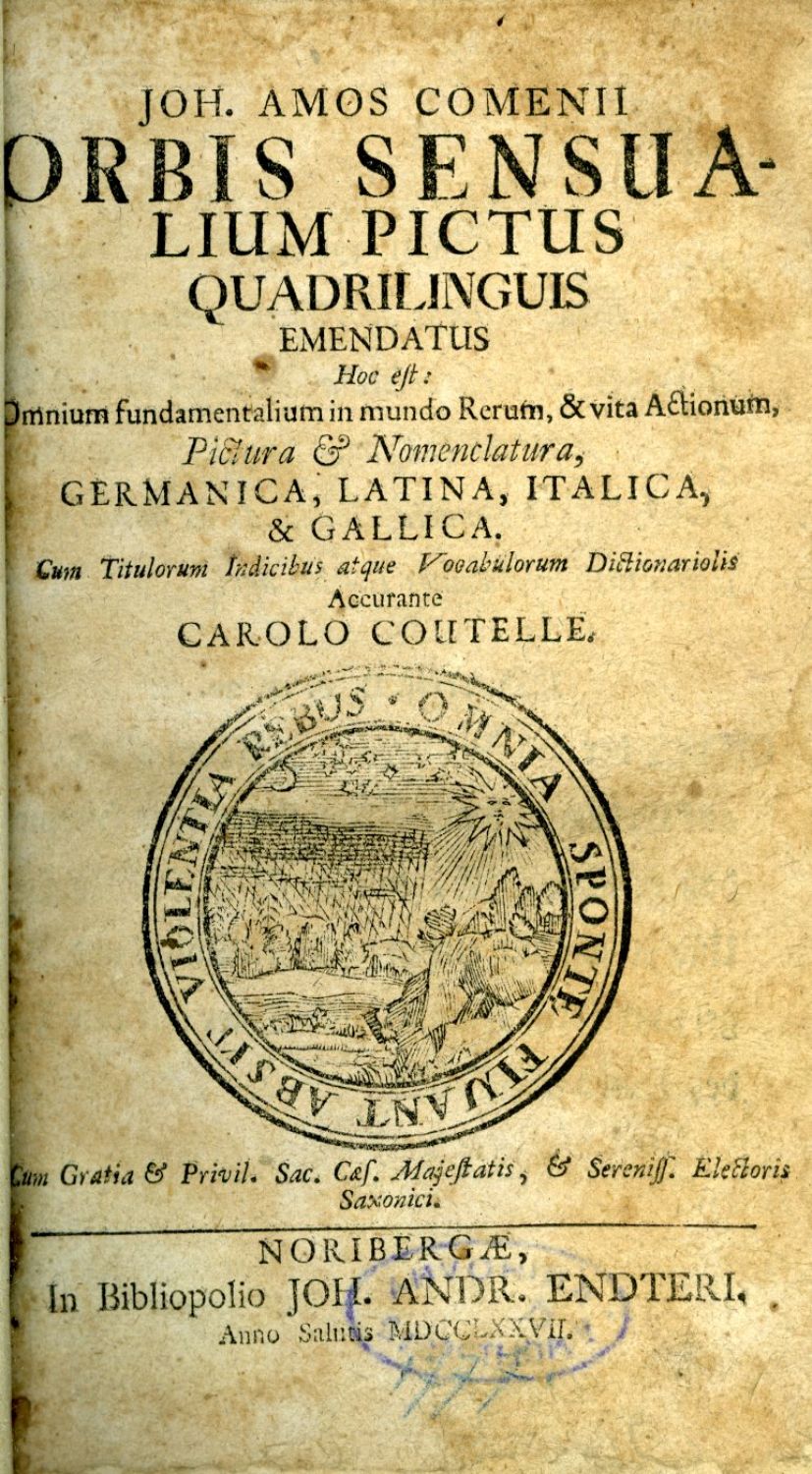 ORBIS SENSUALIUM PICTUS QUADRILINGUIS EMENDATUS Hoc est: Omnium fundamentalium in mundo Rerum, & vita Actionum, Pictura & Nomenclatura, GERMANICA, LATINA, ITALICA, & GALLICA. Cum Titulorum Indicibus atque Vocabulorum Dictionariolis Accurante CAROLO COUTELLE. ...