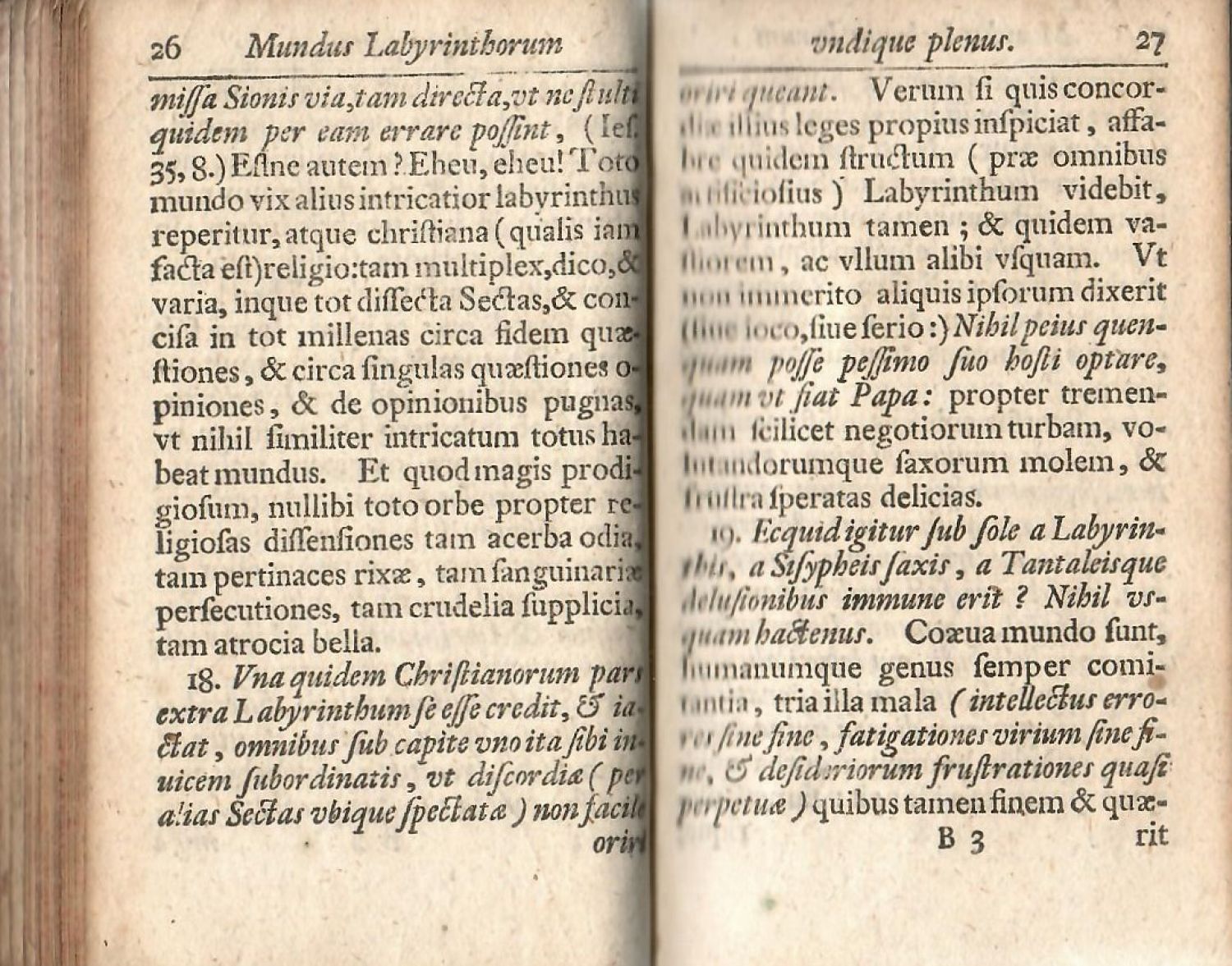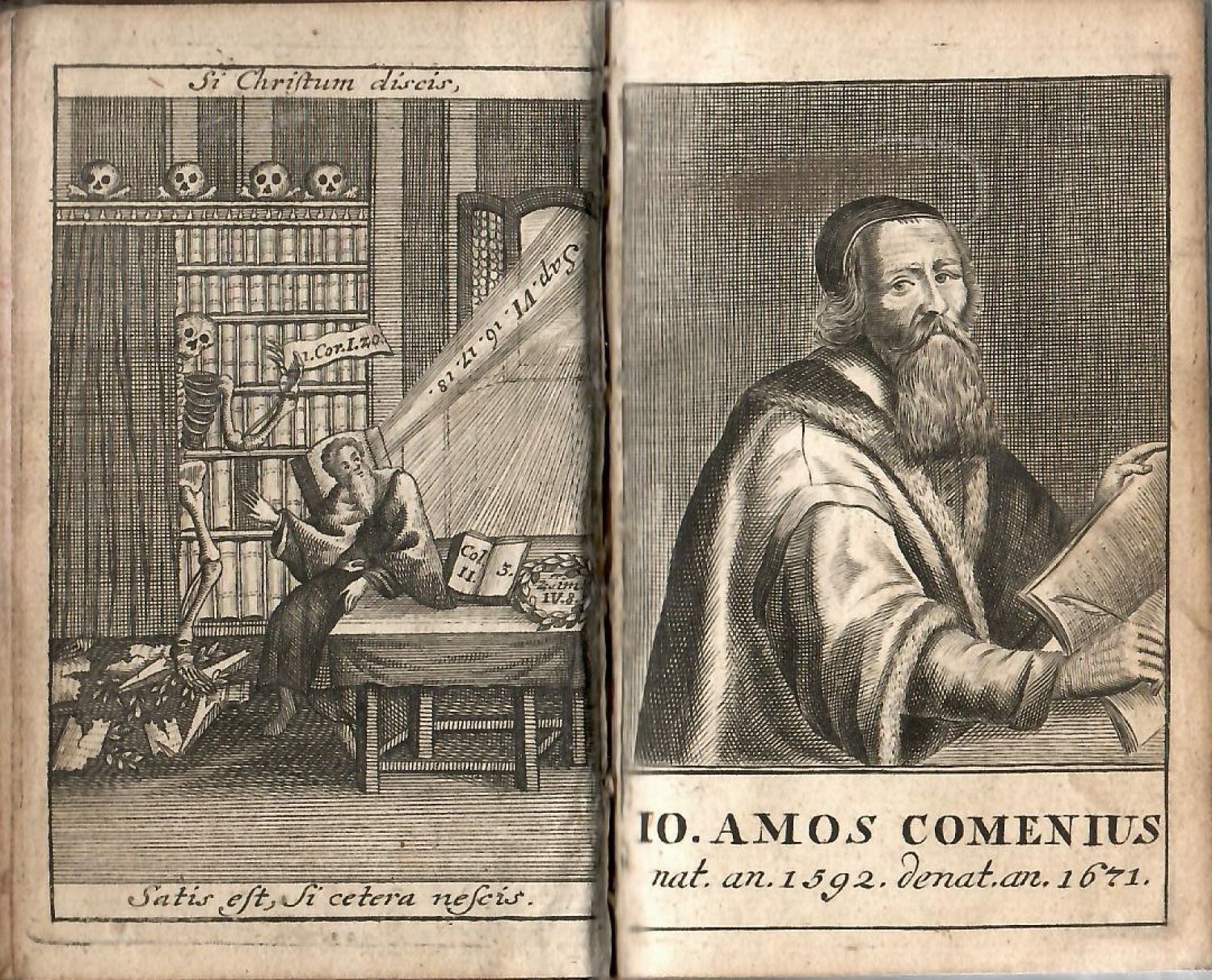 | Ilustrace: | Na rubu prvého listu mědirytina s vyobrazením učence za stolem, kostlivcem před částečně zakrytou knihovnou, rytým textem a odkazy na Písmo svaté, na líci druhého listu mědiryt. portrét Jana Amose Komenského s rytým textem. |