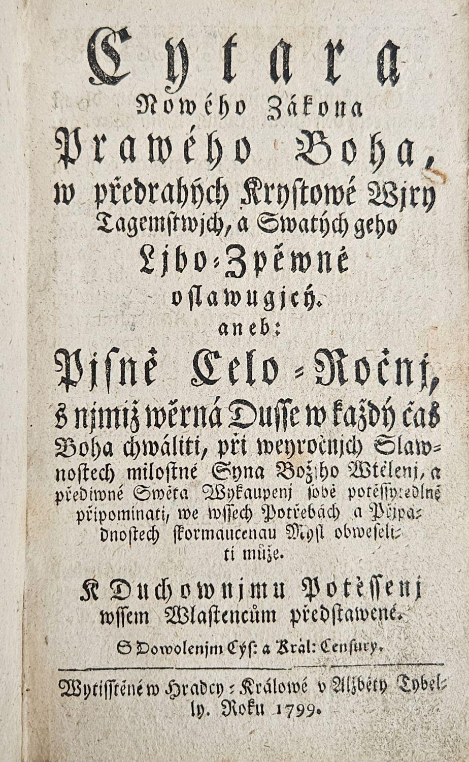 Cytara Nowého Zákona Prawého Boha, w předrahých Krystowé Wjry Tagemstwjch, a Swatých geho Ljbo=Zpěwné oslawugjcý aneb: Pjsně Celo = Ročnj, s njmiž wěrná Dusse w každý čas Boha chwáliti, při weyročnjch Slawnostewch milostné Syna Božjho Wtělenj, a přediwné Swěta Wykaupenj sobě potěssytedlné připominati, we wssech Potřebách a Přjpadnostech skormaucenau Mysl obweseliti může. K Duchownjmu Potěssenj wssem Wlastencům předstawené.