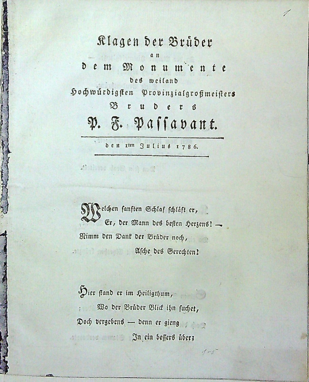 1. "Klagen der Brüder an dem Monumente des weiland hochwürdigsten Provinzialgrossmeisters Bruders P. J. Passavant", bez místa tisku, nakladatele, 1.7. 1786, 4 listy