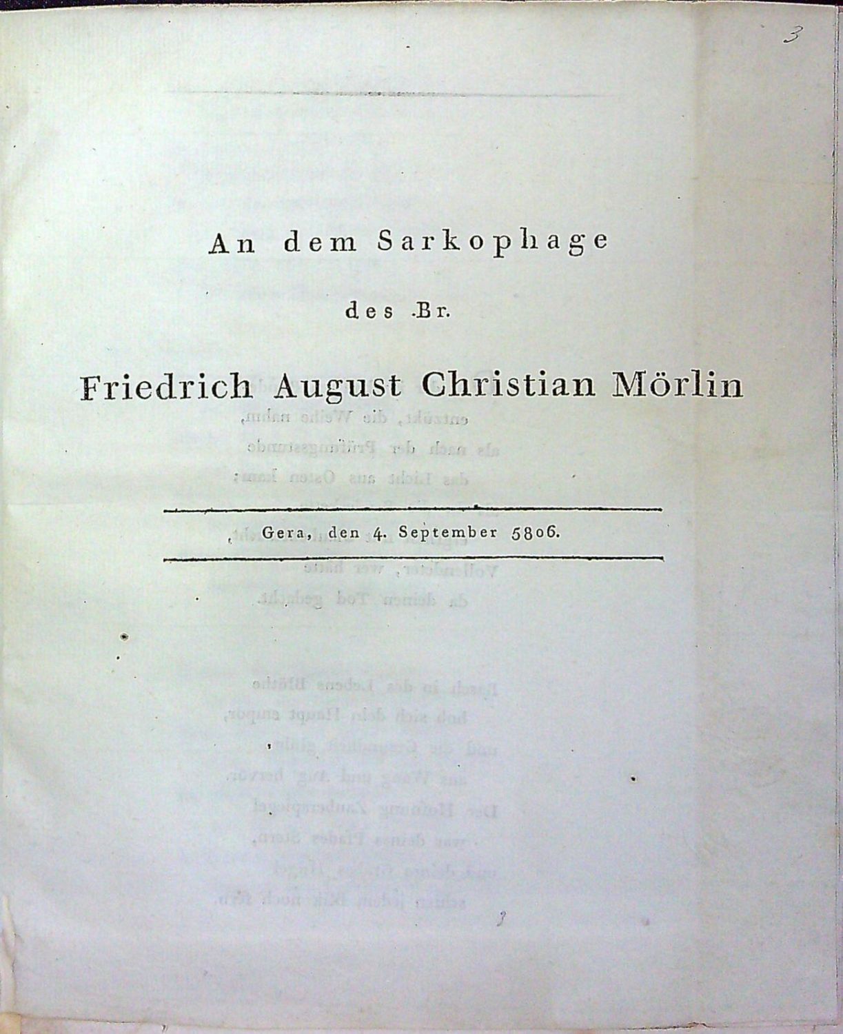 3. "An dem Sarkophage des Br. Friedrich August Christian Mörlin", Gera, 4.9. 5806 (= 1806), 2 listy
