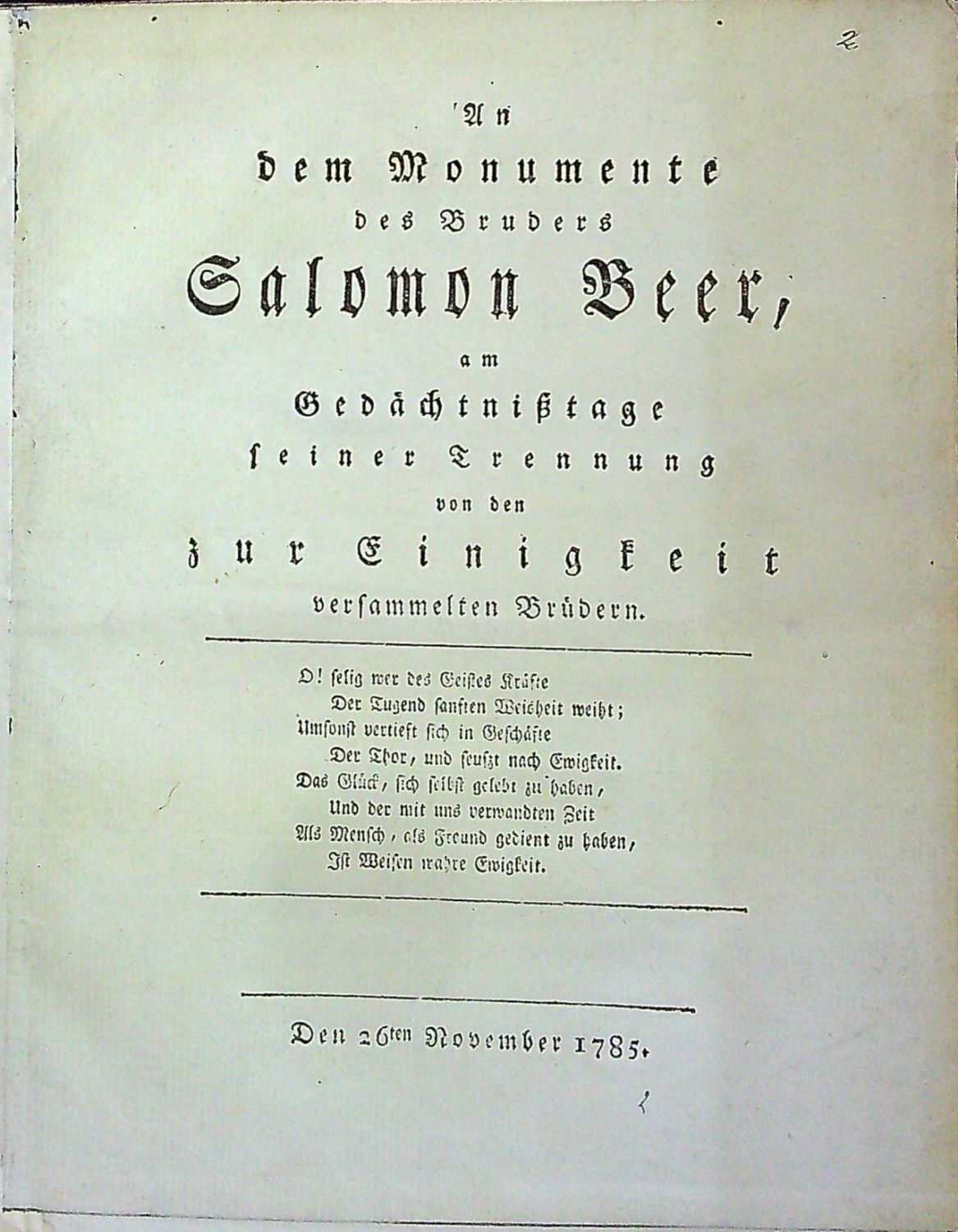 2. "An dem Monumente des Bruders Salomon Beer, am Gedächtnisstage seiner Trennung von den zur Einigkeit versammelten Brüder", bez místa tisku, nakladatele, 26.11. 1785, 4 listy, vstupní vlys s vyobrazením náhrobku, koncová viněta.