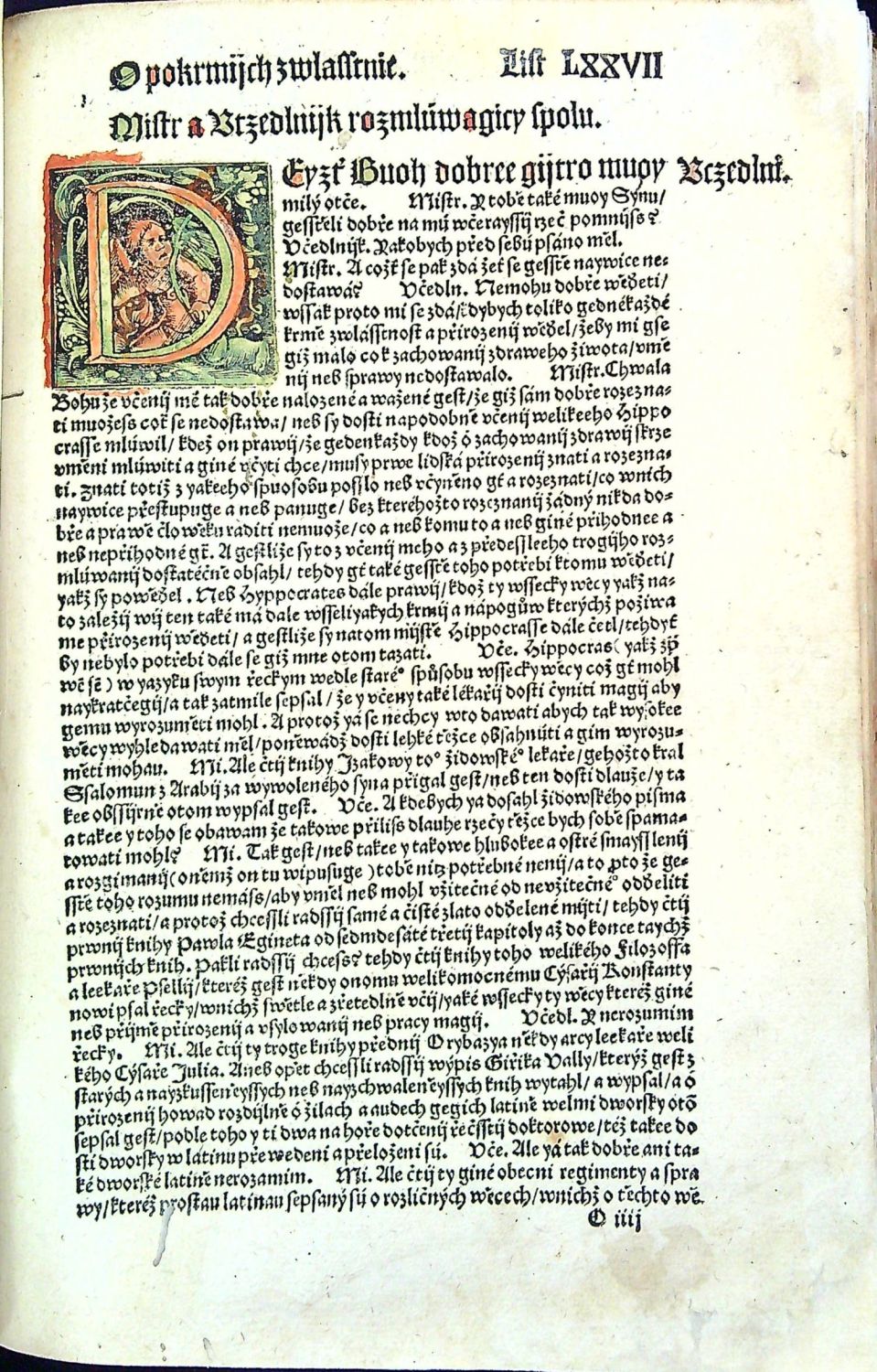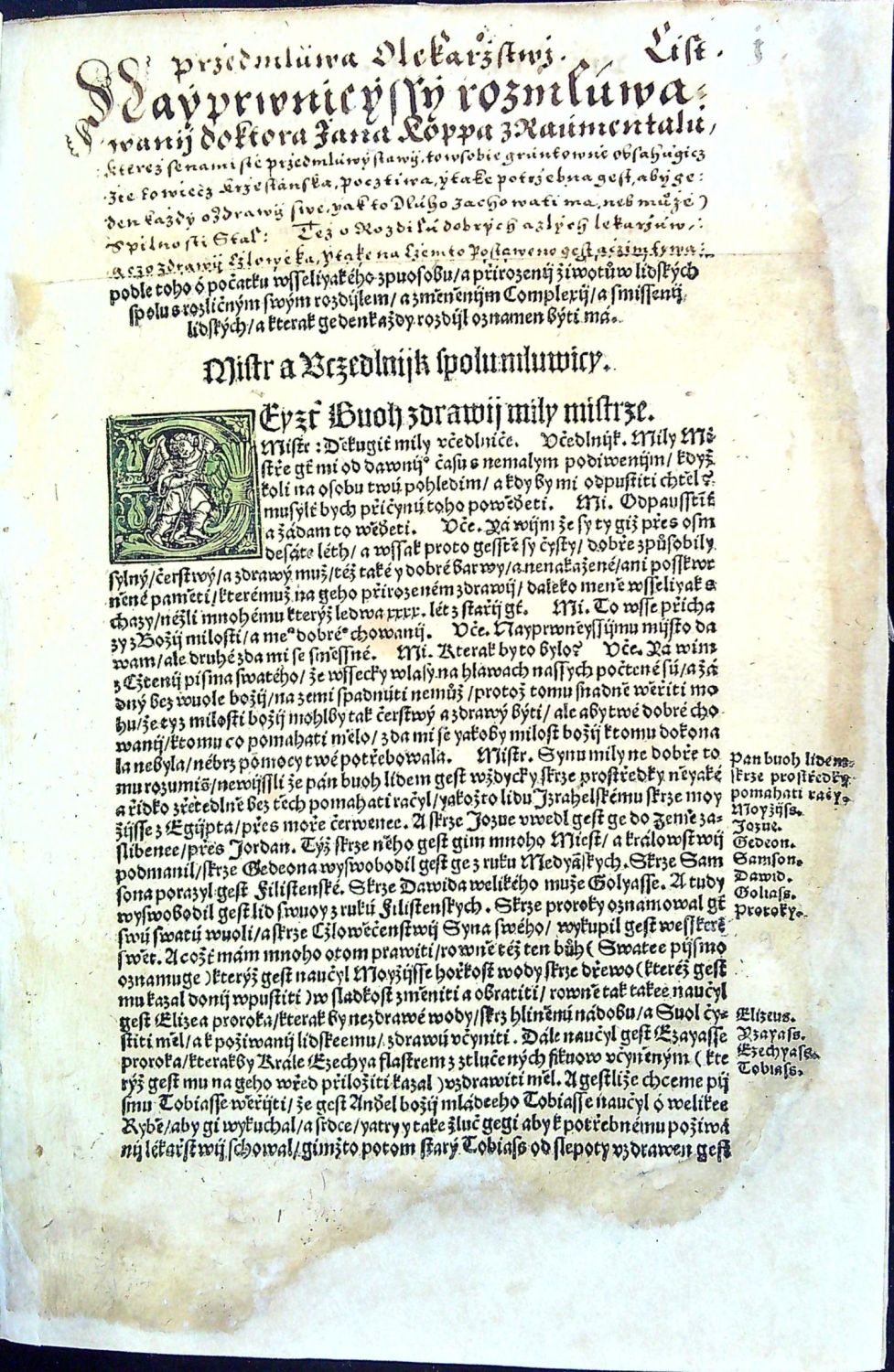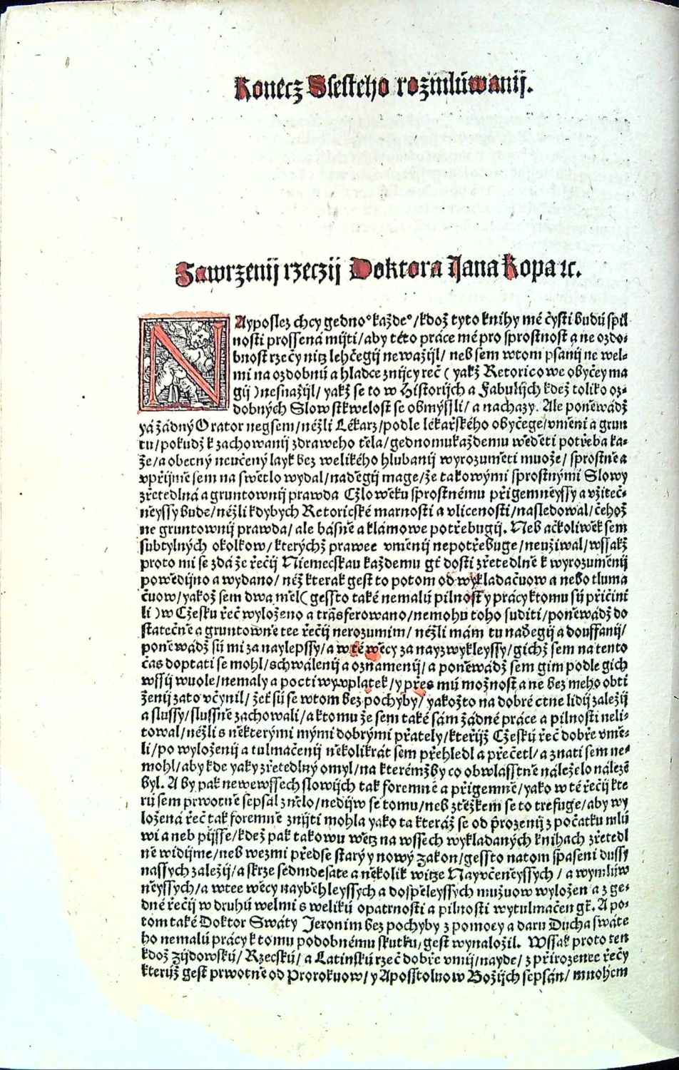 Knihopis 4315<br>Tištěno gotikou, latinská slova antikvou, živá záhlaví, latinská paginace listů při horním vnějším okraji, tištěné poznámky po stranách, rubriky nestejné velikosti. Kniha obsahuje šest rozmlouvání, v úvodu každého rozmlouvání kolorovaná iniciála a též kolorovaný nadpis rozmlouvání.<br>Kartonová vazba potažená rukopisem na pergamenu z první půle 15. století, na obou deskách dvě vázací tkanice, stříkaná svrchní ořízka. Chybí první čtyři listy, folia A4 a A5 při horním okraji dolité v šíři 7 a 5 cm a chybící text kaligraficky hnědým perem dopsaný, též chybí poslední list (konec rejstříku a na jeho rubu tištěný kolofon) - Rejstřík kaligraficky hnědým perem dopsaný. Kniha byla odborně restaurována, papír odkyselen a chybící kousky papíru při spodním i horním okraji dolité (bez zásahu do textu). Na foliu LXX utržen pravý spodní okraj papíru, na několika listech drobné dírky. Místy dobové rkp. marginálie se vztahem k textu. Na foliu CLVIIr a části folia CLVIIIv červeno-zeleně malovaná různá znamení a nečitelný nápis v českém jazyce (....saudu ? pane zapsal ...?) se vztahem k textu (některá písmena na dvoustraně rubrikována, na foliu CLXVIv zeleně malovaná nebeská znamení. Nové ochranné kartonové pouzdro a ochranná krabice. <br> Jan Kopp z Raumenthalu (cca 1487 u Landsbergu am Lech - 1562 či 1563 pravděpodobně ve Stockholmu) německý lékař, spisovatel a astronom, osobní lékař Ferdinanda I. Habsburského a poté švédského krále Gustava I. Vasy. Studoval nejprve ve Freiburgu am Breisgau a studia dokončil na universitě ve Vídni. Or roku 1515 žil krátce v Jáchymově a poté v Mostě, kde se oženil a založil rodinu. Po jistých peripetiích byl roku 1528 povolán do Prahy ke dvoru jako královský lékař. Nabízená kniha je jeho stěžejním dílem, do češtiny ji přeložil Hynek Krabice z Veitmile.