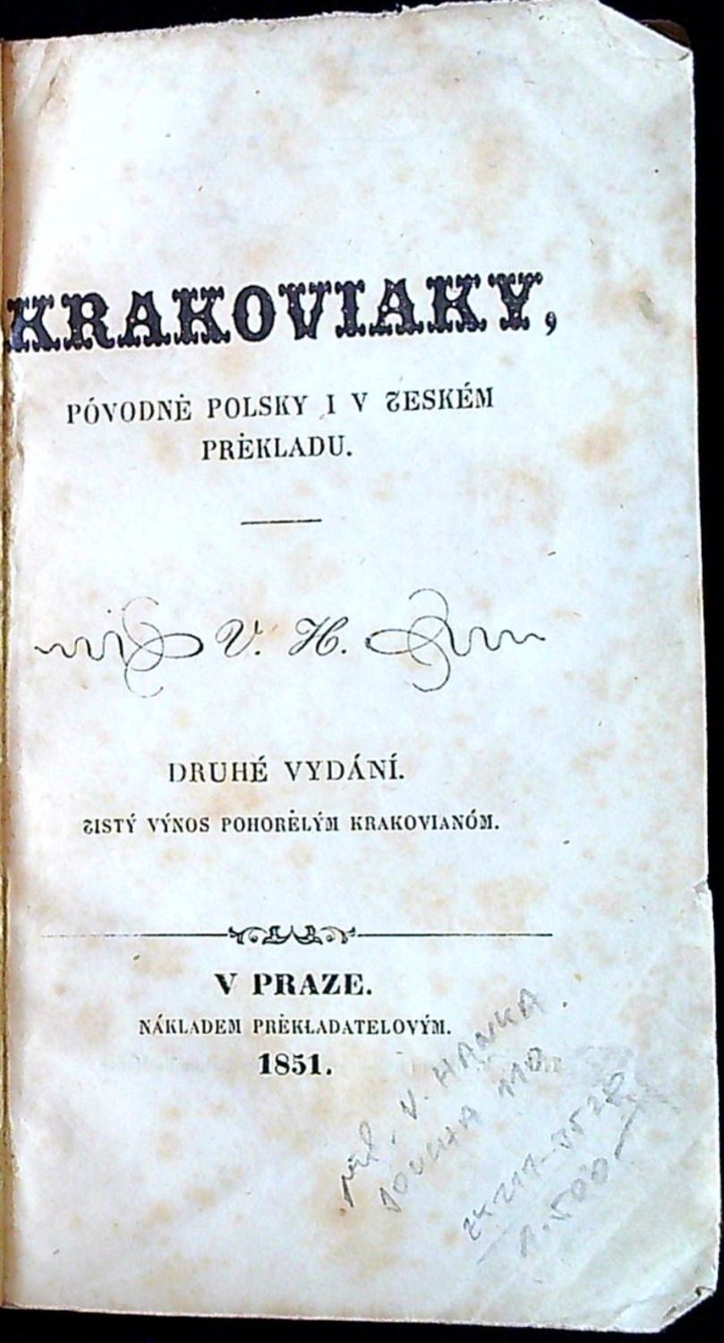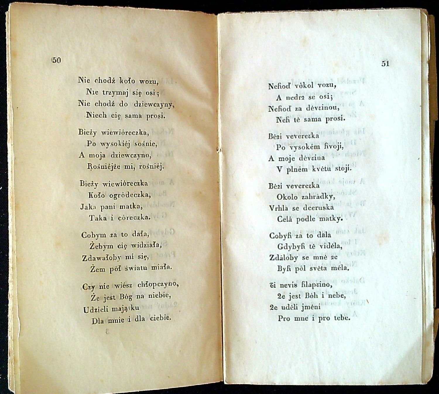 Doucha 110<br>Tištěno antikvou, na sudých stranách původní polský text, na lichých Hankův převod do češtiny. V úvodu Hankova poznámka o polské výslovnosti. Za textem tři rozkládací arabsky číslované přílohy s notací a nápěvy v češtině i polštině. Na tit. listu mezi kompozicí z vlnovek Hankovy iniciály. - Původní pap. obálka, na přední straně klasicistní rám zdobený rostlinným ornamentem, na straně zadní stejný rám s vinětou puttiho uprostřed, při spodním okraji údaj o tiskaři (C.k. knihtiskárna Synóv Bohumila Haase). Při okrajích obálky oslí uši, v textu tu a tam drobné hnědé svrnky způsobené kyselostí papíru.