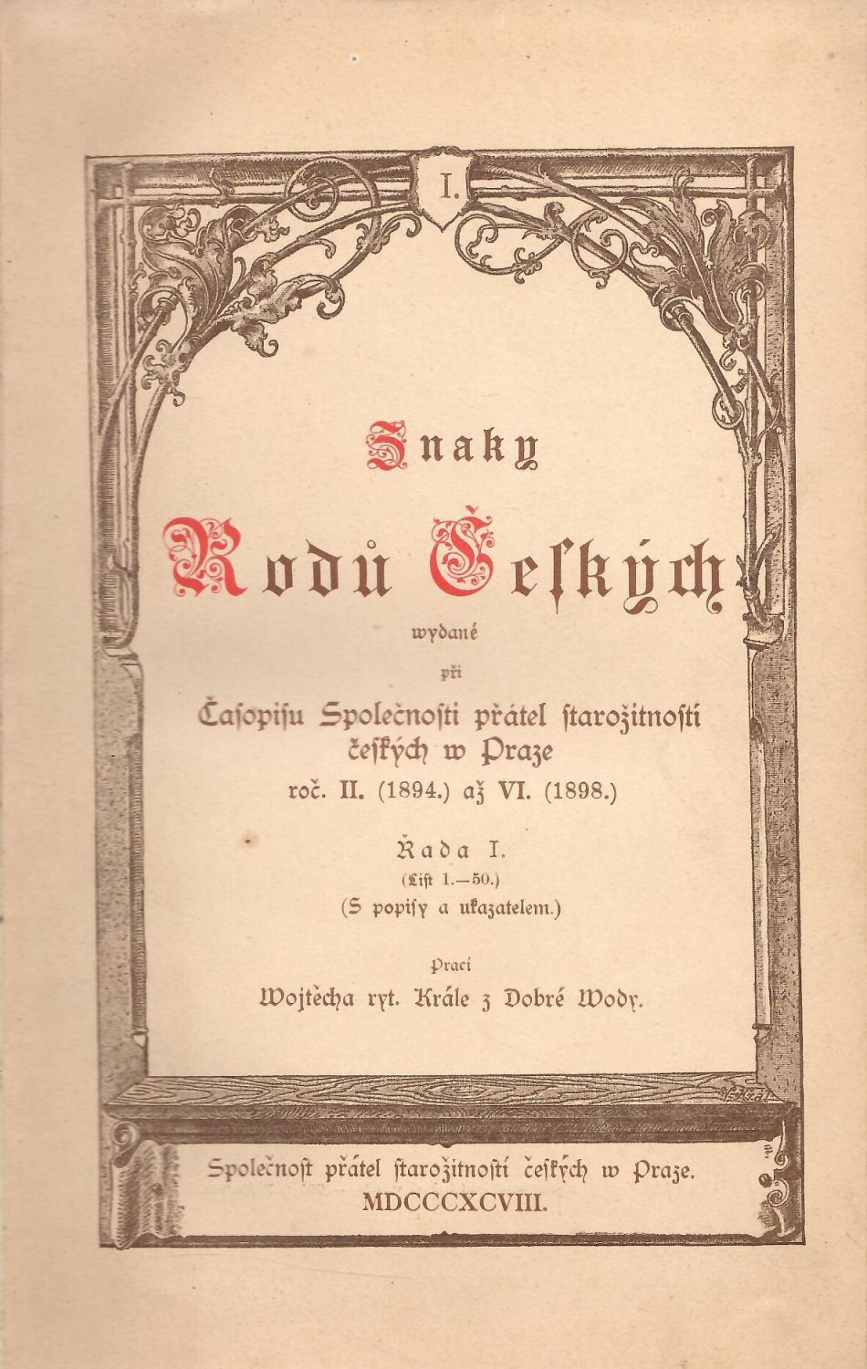 Znaky Rodů Českých wydané při Časopisu Společnosti přátel starožitností českých w Praze roč. II. (1894.) až VI. (1898.) Řada I. (List 1. - 50.) (S popisy a ukazatelem.) Prací ...