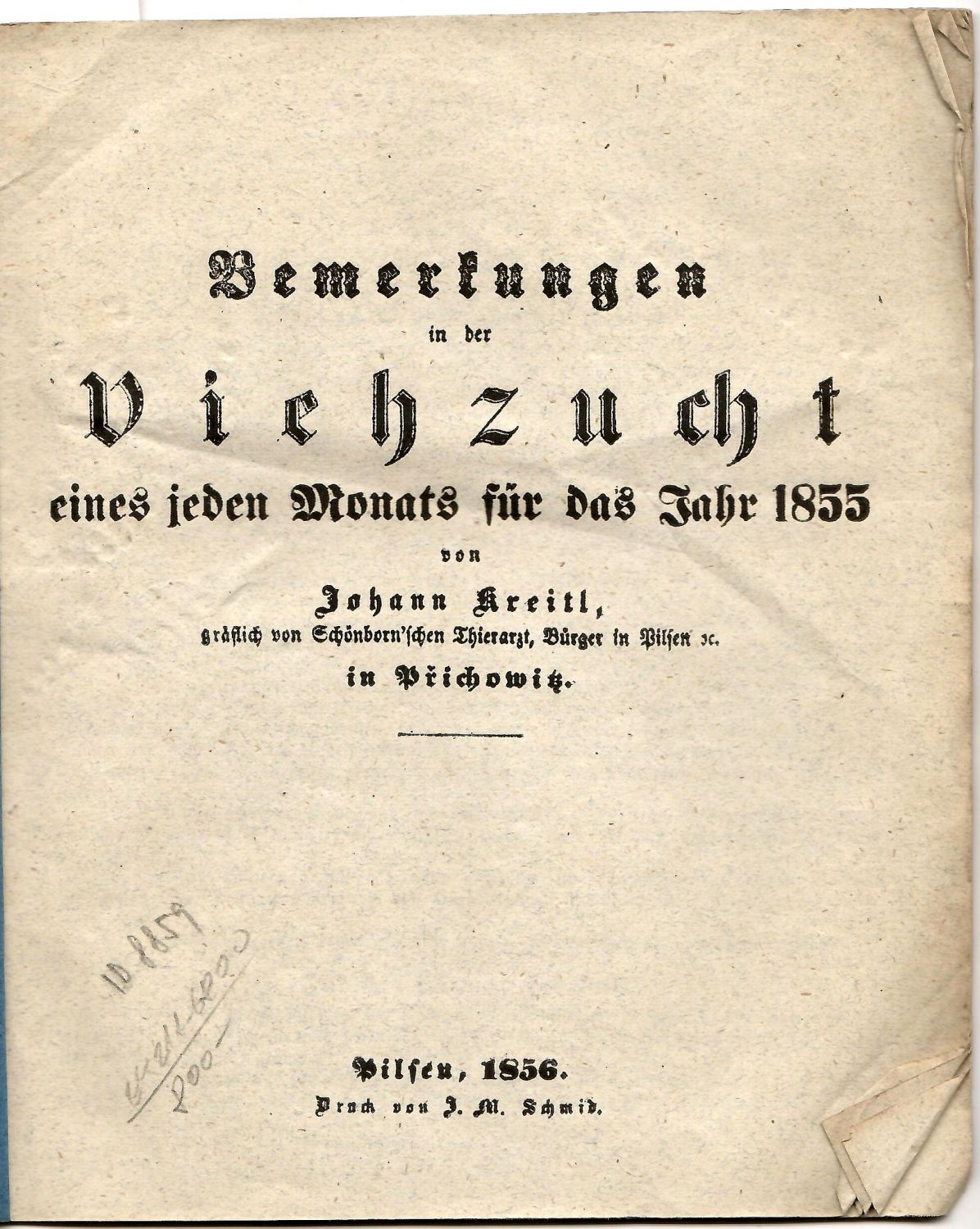 Tištěno gotikou, arabská paginace stran uprostřed horního okraje mezi krátkými pomlčkami, tučně tištěné nadpisy rad pro jednotlivé měsíce. <br>Dobová obálka z modrého papíru, papír na obálce místy pomačkaný, v textu zahnědlý, oslí uši (při spodním okraji výraznější.<br>Brožura obsahuje rady jak se starat o dobytek v jednotlivých měsících roku z pera Johanna Kreitla, zvěrolékaře působícího u hraběte Schönborna a plzeňského měšťana.