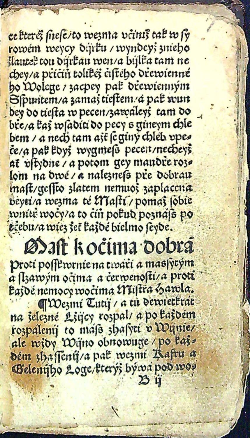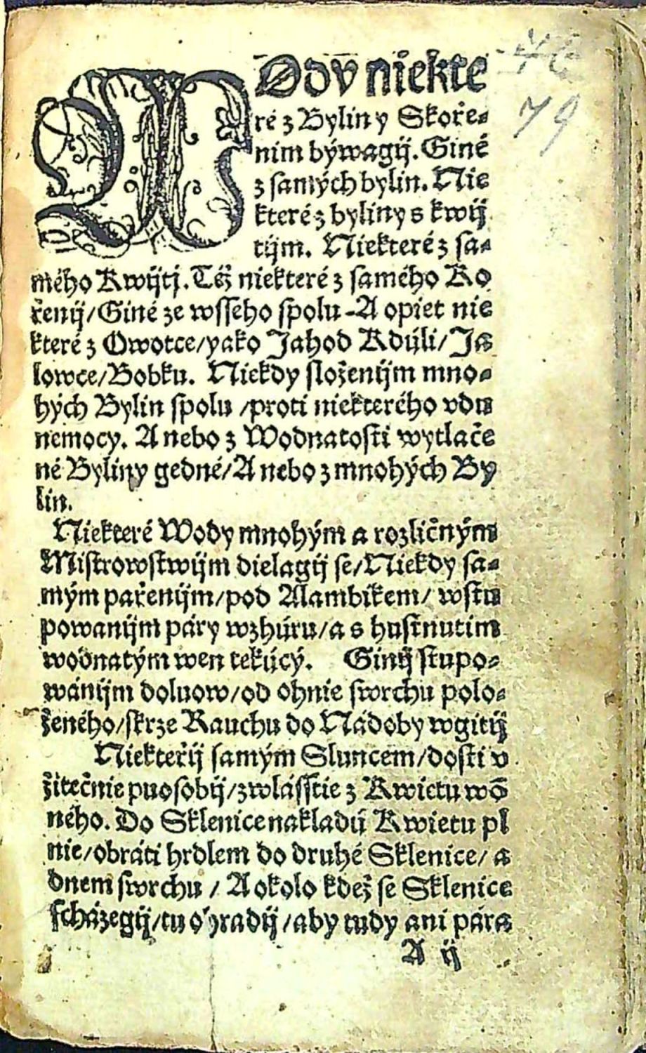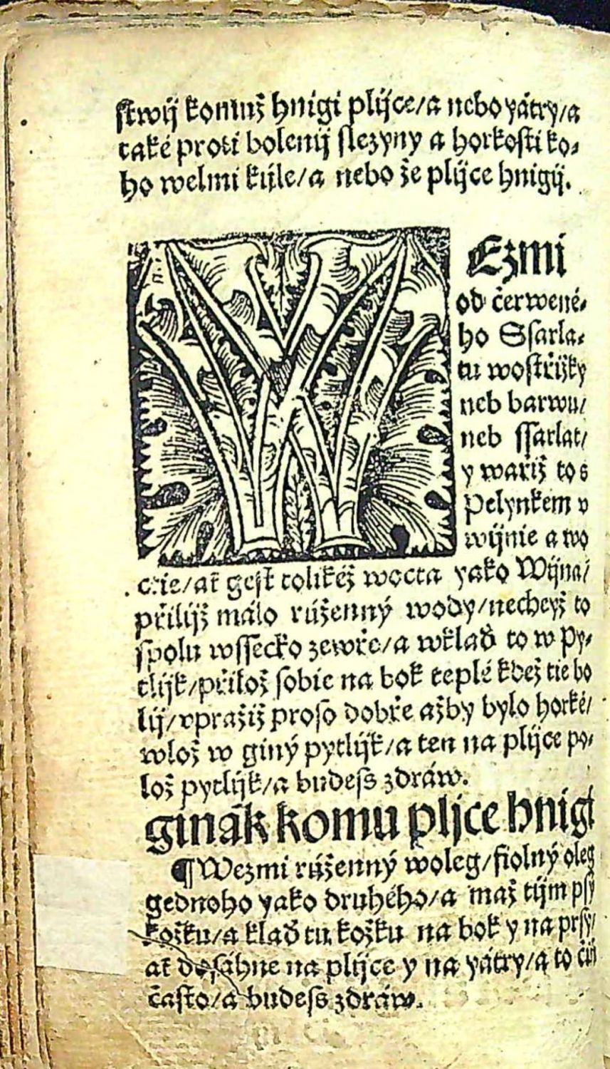 Knihopis 4588 eviduje 6 pravděpodobně neúplných ex.<br>Tištěno frakturou. Konturové iniciály v černém rámečku na šrafovaném pozadí zalomené do výše 4 řádků, konturové iniciály na rostlinném pozadí zalomené do výše 5-9 řádků, plné iniciálky zdobené drobnými úponky ve výši 5 řádků. Na rubu folia H5 dřevoryt v černém rámečku (50 x 60 mm) s vyobrazením lékaře s baňkou ve vztyčené ruce a nadpisem "Spis tento k lijkarzstwij tobie má pohodlney beyti ....", na rubu folia J3 dřevoryt v černém rámečku (65 x 40 mm) s vyobrazením působení zvěrokruhu na lidské tělo. Tištěné rubriky, vrstvové kustody - Chybí folia A1 (tit. list) až A8,B1,B8,E4,F2,F7,K6,K8 (= 15 listů). Na prvých dvou předvázaných listech rkp. poznámky v němčině z 18. století v závěru v češtině "? Neviny na perštejně I. v Praze". Další tři folia čistá, na dalším na rubu rkp. poznámka v němčině, na dalších třech kaligraficky psaný zkrácený text chybících folií A2-A8 a B1, na foliu H5 rkp. marginálie z roku 1624 v českém jazyce. <br>+ přívazek: Jan Černý: "Poczinagi se knijžky o rozličných wodách krátce wybrané z mnohých knih Mudrcuow kterak a z kterého kořenij máss ge páliti wedlé swého Rozumu a naučenij". Staré Město Pražské, Jan Kantor Had, [1556-1568]. A8-D8 (= 32 listů). (Knihopis 5510 eviduje 2 neúplné ex.; Voit: Český knihtisk, 2017, str. 718, č. 77). Tištěno frakturou, stránkové kustody, signatury, rubriky, vstupní plná iniciála propletená úponky zalomená do výše 6 řádků, na konci textu tyč z kulatých závorek s tečkou od sebe oddělených dvojtečkou, na rubu impresum. Chybí folia A1 (tit. list), C1 a C8 (= 3 listy), folium B1 vevázané za foliem B3. Poslední list při pravém spodním okraji utržený. Rkp. marginálie v českém jazyce nad impresem a na zadním vakátu. <br>Vazba z konce 16. či první poloviny 17. století, dřevěné destičky potažené černou hovězinou, na obou deskách tlačené zrcadlo s rámem zdobeným tlačeným rostlinným ornamentem, ve hřbetu 3 vazy, na obou deskách zbytky trnů, na zadní desce na několika místech chybí malé kousky koženého pokryvu, papír zahnědlý. <br>Křišťan z Prachatic (před rokem 1370 Prachatice - 5.9. 1439 Praha) astronom, matematik, lékař a teolog. Stoupenec Mistra Jana Husa. Až do konce svého života působil na pražské universitě, několikrát byl zvolen děkanem filosofické fakulty a čtyřikrát rektorem university. Jeho nejdůležitější práce jsou dva astronomické spisy o astrolábu, které získaly ohlas i v zahraničí. Krom toho napsal řadu lékařských prací.<br> Jan Černý, latinsky Niger (cca 1456 v Praze - 1530 v Prostějově), vystudoval pražskou universitu, kde roku 1479 dosáhl stupně bakalářského, poté soukromě studoval medicínu. Okolo roku 1490 se usadil v Litomyšli, mezi jeho příznivce náležel Vilém z Pernštejna a Jan Černý se stal lékařem pernštejnského rodu. Roku 1501 se odstěhoval do Prostějova. Byl členem Jednoty bratrské. Jeho "Knieha lékařská" je prvým původním česky tištěným herbářem a patří mezi nejvýznamnější díla českého humanistického lékařství. Autor na základě vlastního studia pojednává o léčebných účincích vybraných rostlin. Jeho mladší bratr byl Lukáš Pražský.