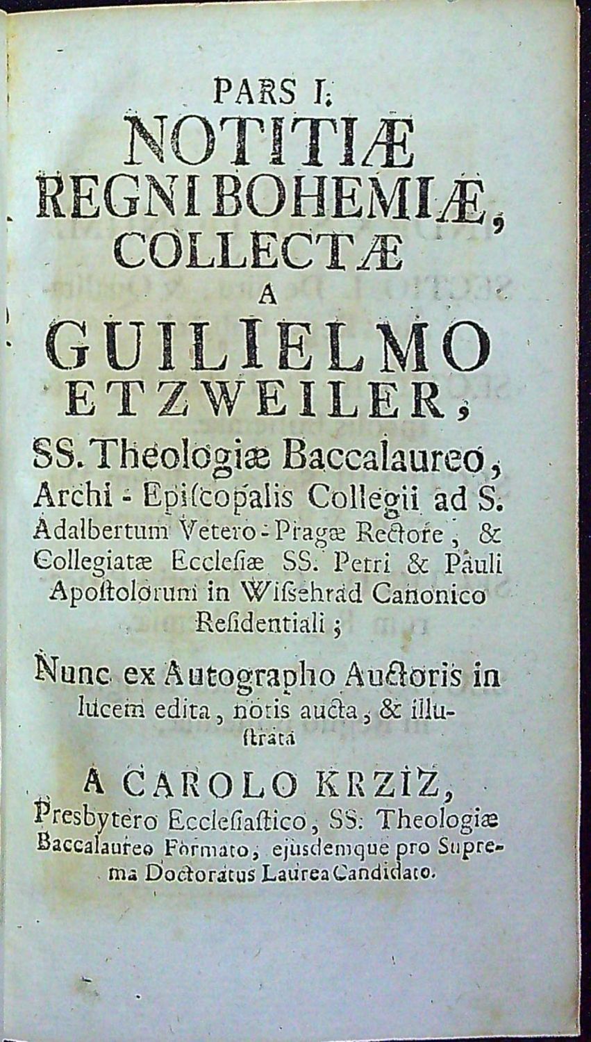 Zíbrt I, 1411; II, 226; Pumprla V,2559; BCBT 06134<br>Latinský text tištěný antikvou, český a německý švabachem, tištěné poznámky pod čarou, neživá záhlaví, paragrafy, tučně tištěné versálky ve výši 2 řádků, ozdobná tyč z ornamentů, na straně III prvního dílu a na straně 3 druhé části drobné ilustrace v úvodu textu. - Dobová vazba z hnědé teletiny, ve hřbetu 5 vazů, ve druhém poli dobový červený kožený štítek s tlačeným názvem, červeně barvené ořízky. Vazba ohmataná a místy odřená. Titulní list uprostřed spodního okraje podlepený, na prvních 4 listech při vnějším spodním okraji několik drobných dírek od červotoče. Na předním přídeští nečitelný proven. přípis.