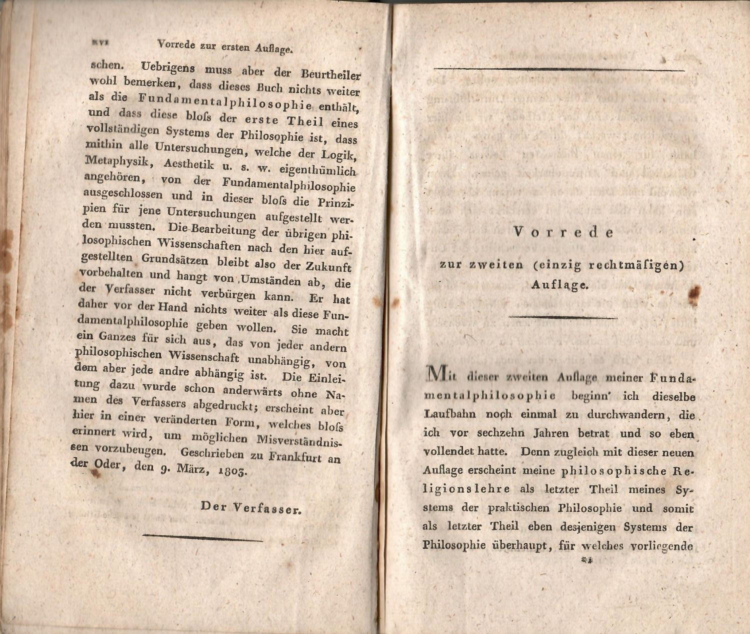 Tištěno antikvou, živá záhlaví, paragrafy, tištěné poznámky pod čarou. V úvodu dvě předmluvy autorovi, prvá převzatá z prvního vydání z roku 1803, druhá autorem napsaná k tomuto 2. opravenému a rozšířenému vydání, datovaná v Lipsku 9.3. 1819.<br>Dobová kartonová vazba potažená dobovým papírem, ve hřbetu pap. pokryv potrhaný, barvené ořízky. Vazba ohmataná a zašpiněná, naražené rohy, papír zahnědlý, tu a tam drobné hnědé skvrnky.<br>Wilhelm Traugott Krug (22.6. 1770 Radis - 12.1. 1842 Lipsko), filosof, od roku 1805 působil jako nástupce I. Kanta na uviversitě v Královci a od roku 1809 v Lipsku. Člen zednářské lóže "Minerva" v Lipsku a roku 1833/34 liberální poslanec 1. komory prvního ústavního saského zemského sněmu, mimo jiné předložil sněmu petici za emancipaci Židů v Saském království. Nabízená práce je jeho nejdůležitější knihou, popisuje v ní svůj filosofický systém, první vydání vyšlo roku 1803.