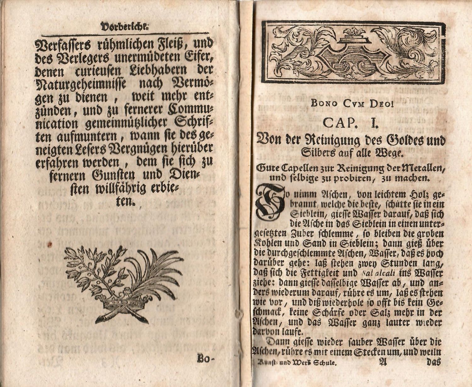 KVK neeviduje; Worldcat neeviduje<br> Tištěno švabachem, latinský text antikvou, živá záhlaví od sazby oddělená jednoduchou linkou, na tit. listu viněta, v textu drobné vinětky, koncová viněta, pásové vlysy, římsky číslované kapitoly. Na posledních 57 nepaginovaných stranách rejstřík. Kniha obsahuje celkem 65 kapitol. - Jedná se o upravené a zkrácené dílo slavného Kunkelova spisu "Curieuse Kunst und Werk-Schul" poprvé vydaného v Norimberku 1696 a podruhé tamtéž v letech 1705-07. Nabízená práce odpovídá rozsahem prvnímu dílu prvního vydání.<br>Dobová vazba s deskami z prkének potaženými papírem, papírový pokryv místy odřený, ve hřbetu chybí zcela.<br>Johannes Kunckel von Löwenstern (cca 1630 Wittenberg - 20. 3. 1703), významný německý alchymista a sklář. Švédským králem Karlem XI. povýšený do šlechtického stavu.