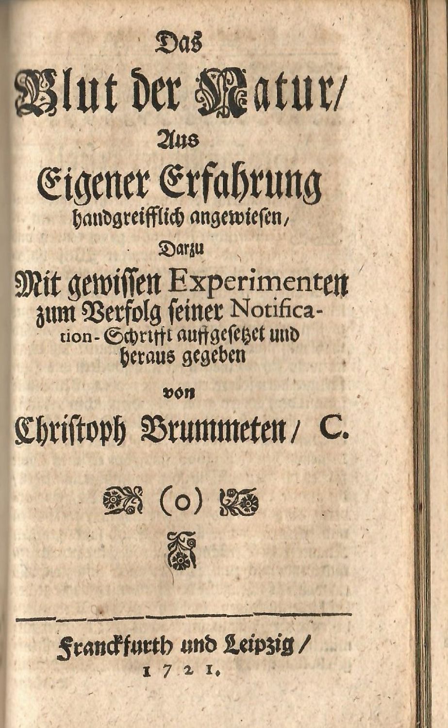 V. Curiose Chymische Tractätlein; I. Chymische Anmerckungen, darinn gehandelt wird von denen Princip. Chym. Sal. Acid. & Alcalibus; Fixis & Volatilib. in denen 3. Regnis; wie auch vom Geruch und Farben etc. mit Anhang einer Chymischen Brille, contra Non-Entia Chym. II. Nützliche Obsevationes von den Fixen und flüchtigen Saltzen, Auro & Argento Potabili; Spiritu Mundi u. d. g. wie auch von den Farben und Geruch der Metallen, Mineral. &c. III. Epistola, contra Spiritum Vini sine Acido. IV. De Phosphoro Mirabili; dessen leuchtenden Wunder=Pilulen; sampt einem Discurs vom Nitro. V. Probier=Stein, de Acido & Urinoso, Sale Calido & Frigido; contra Herrn D. Voigts Spir. Vini Vindicatum. Wobey zugleich angehänget wird: Christoph Brummets Tractätlein vom Blut der Natur. Nebst einer Vorrede: De doctis et nobilibus Empiricis: D. Johannis Philippi Burggravii, Med. Francof. ad Moenum.