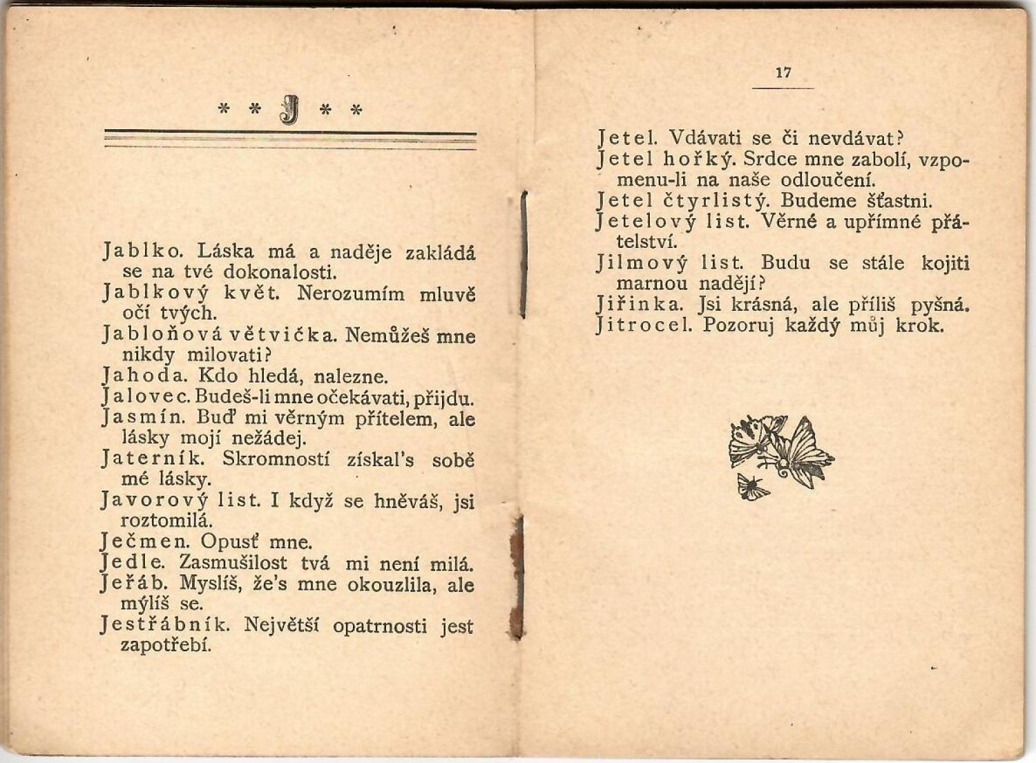Litografická obálka, kterou vytiskl A. Haase (zadní strana obálky chybí), několik černobíle tištěných ilustrací a drobných vinět. Na tit. listu staré razítko pražského knihkupectví, na rubu podpis tužkou Jiřího Šalamouna. - V úvodu poetické knížečky krásného obsahu "Květomluva všeobecná", na straně 53 "Naznačení hodin květinami", na straně 55 "Věštba květinná" a v samém závěru "Květomluva barev". - Na zadní straně perforované iniciály jednoho z předchozích vlastníků. (SKC neeviduje).