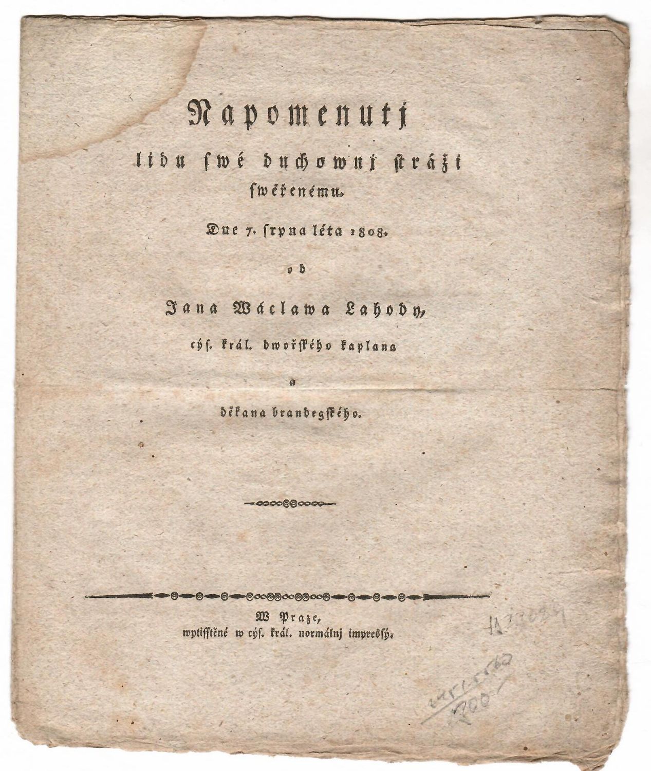 Napomenutj lidu swé duchownj stráži swěřenému. Dne 7. srpna léta 1808. ...