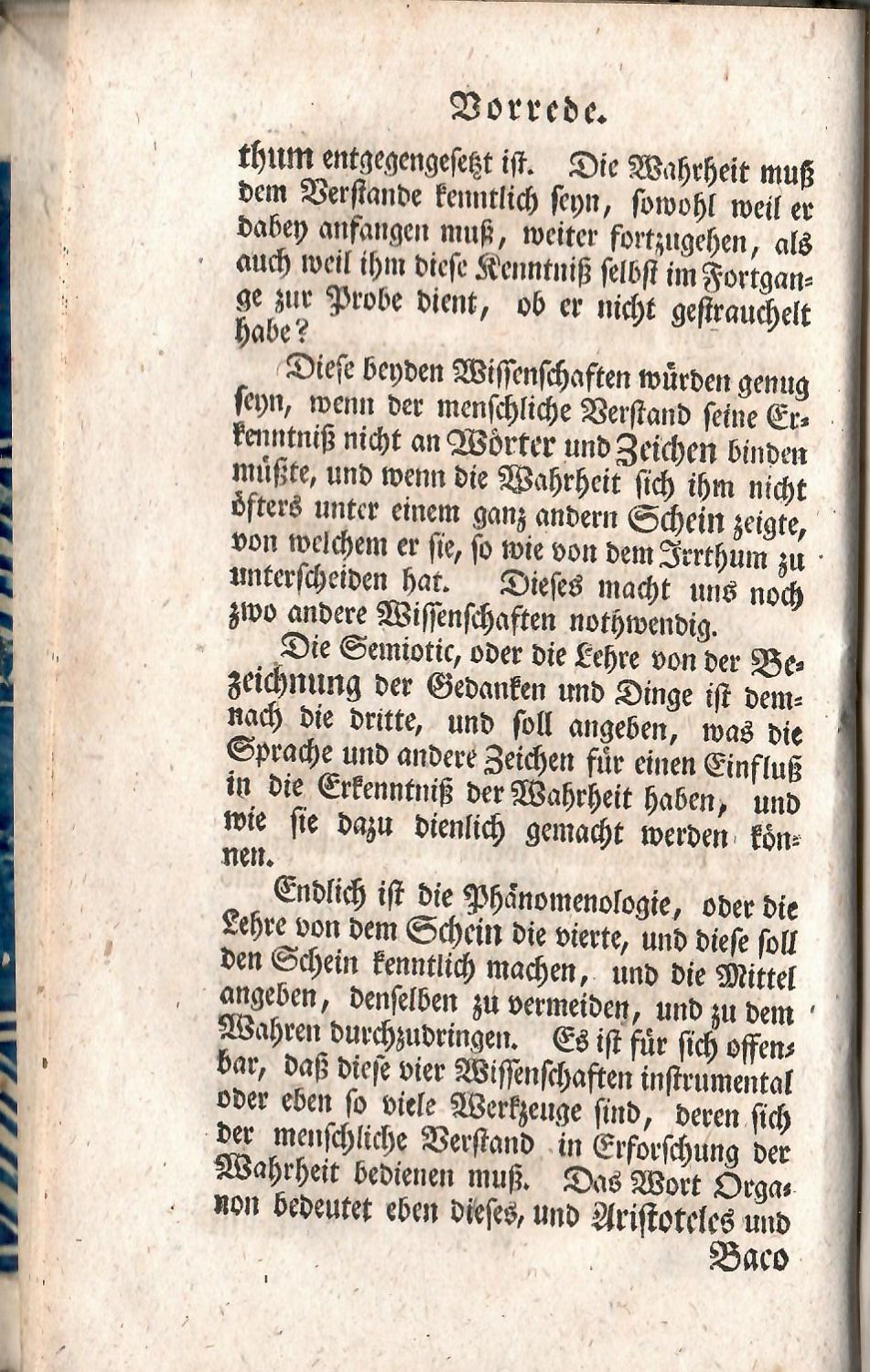 Goedecke IV, 1,479,4,2<br>Tištěno švabachem, latinská slova antikvou, živá záhlaví, dva dřevorytové vlysy, dvě iniciálky zasazené vv rostlinné kompozici. <br>Dobová vazba s kartonovými deskami potaženými olejovým papírem, pergamenový hřbet a nárožnice, při horním okraji hřbetu světlý dobový kožený štítek s tlačeným a zlaceným názve,, barvené ořízky. Vazba ohmataná a místy lehce odřená, pergamen. ve hřbetu místy lehce natržený, zlacený název ve štítku vybledlý.<br>Johann Heinrich Lambert (26.8. 1726 Mylhúzy - 25.9. 1777 Berlín) švýcarský matematik, fyzik, astronom a filosof. Jako první aplikoval hyperbolické funkce v trigonometrii. Patřil k průkopníkům kartografické projekce a vynalezl vlhkoměr. Z filosofických prací je jeho nejvýznamnějším dílem nabízená práce, ve které zkoumá vztah subjektivního a objektivního, shrnuje úvahy o logické stavbě poznání, pravidlech myšlení a metodách vědeckých výzkumů, rozvíjí myšlenky symbolického jazyka s cílem omezit nejednoznačnost pojmů. Známá je jeho rozsáhlá korespondence s Imanuelem Kantem.