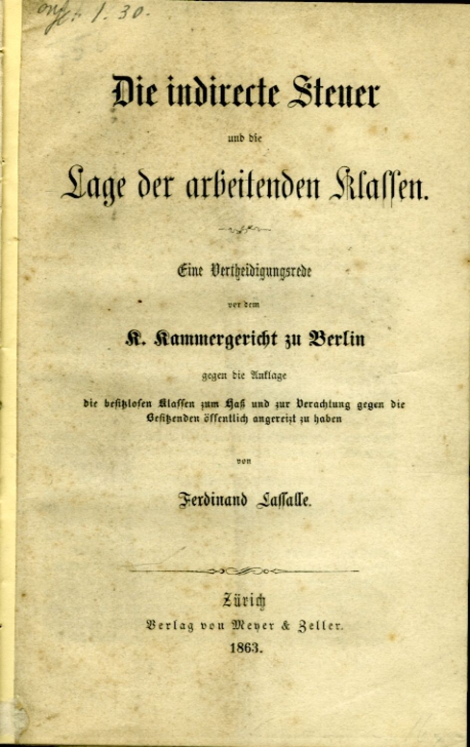 Lassalle, Ferdinand: Die indirecte Steuer und die Lage der arbeitenden Klassen. Eine Vertheidigungsrede vor dem K. Kammergericht zu Berlin gegen die Anklage die besitzlosen Klassen zum Haß und zur Verachtung gegen die Besitzenden öffentlich angereizt zu haben ... Zürich, Meyer & Zeller, 1863. 8°, (2), 136 s.<br>