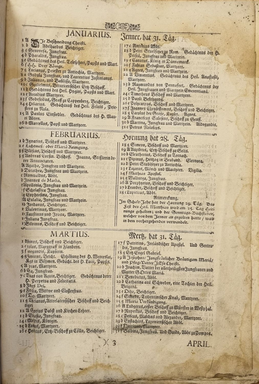 Das Christliche Jahr, oder die Episteln und Evangelien, Auf die Sonn=Gemeine=Ferial=und Fest=Tage des gantzen Jahres, Sambt dererselben Auslegung, In gebundener und ungebundener Rede: Einem kurtzen Begriff deß Lebens von denen Heiligen derer Gedächtnus gegangen wird. Aus Der Frantzösischen in die Teutsche Sprach übersetz. Und Durchgehends mit Kupffern gezieret. I.,II. Theil