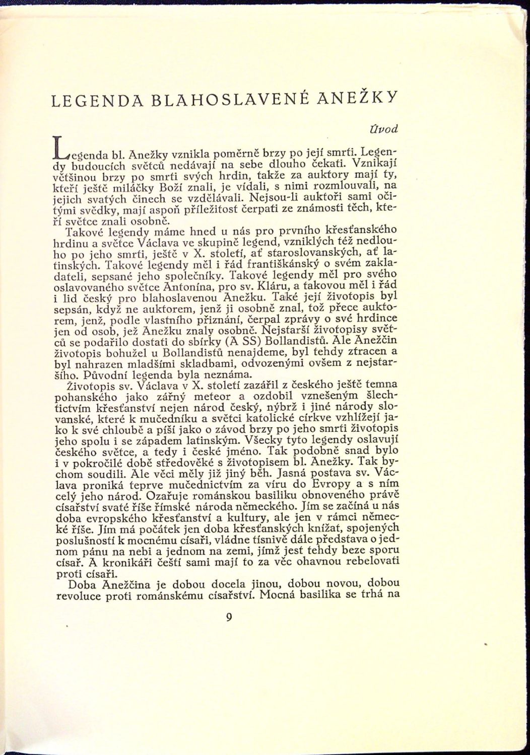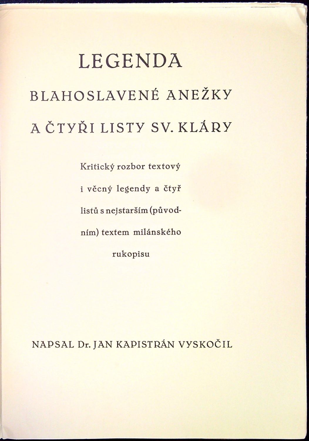 Legenda blahoslavené Anežky a čtyři listy sv. Kláry. Kritický rozbor textový i věcný legendy a čtyř listů s nejstarším (původním) textem milánského rukopisu.
