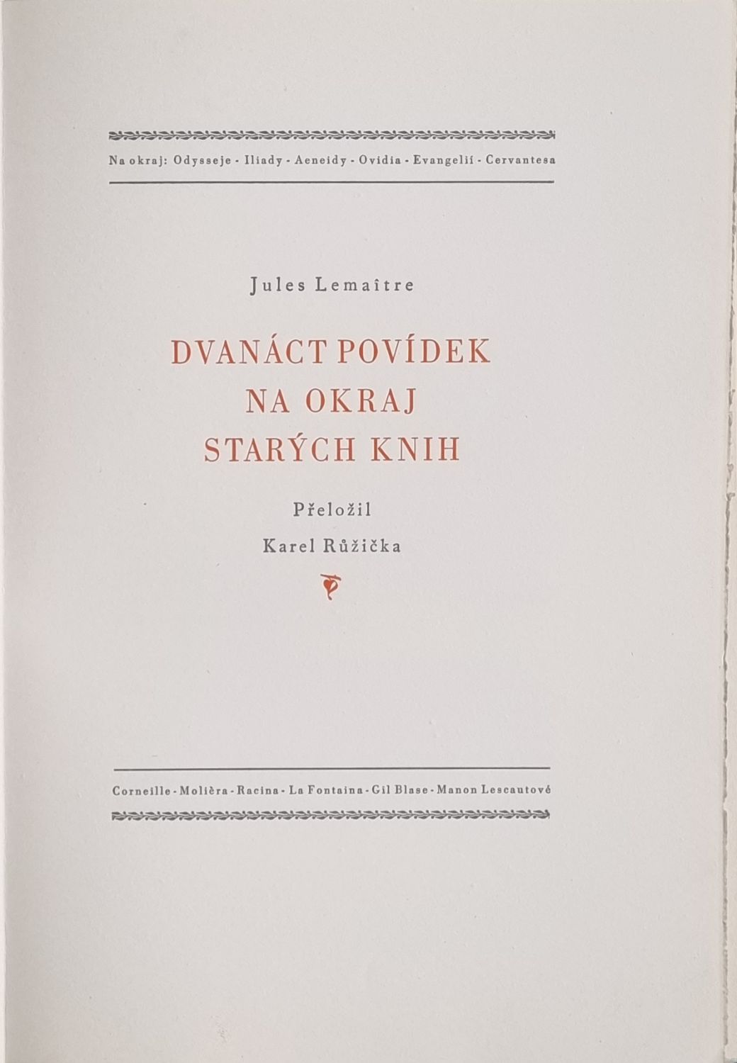 Ex. č. 45 z 99 vydaných, které na ručním lisu vytiskl a typograficky upravil Josef Cipra z písma cicero Fournier na ruční Maršovský papír. Přeložil Karel Růžička, V tiráži je uvedeno datum 1949, ve skutečnosti kniha byla vytištěna v lednu roku 1952. V tiráži podpis překladatelův. Červeno-černě tištěný titulní list.<br>Původní papírová obálka s chlopněmi, ve které jsou volně vložené složené tiskové archy. Ve stavu intaktním.