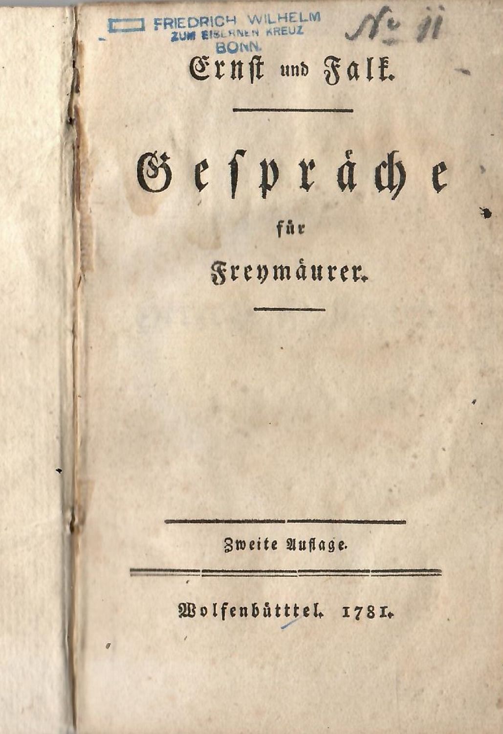 Wolfstieg 1373<br>Tištěno švabachem, uprostřed horního okraje stran dvojitá mizící linka. Prvá knížka obsahuje 1-3 rozhovor a na tit. listu je vytištěno II. vydání, Wolfenbüttel 1781; druhá kniha obsahuje 4-5 rozhovor, na tit. listu je oproti svazku prvnímu ještě dotištěno "Fortsetzung" a datace 1780, bez místa tisku. <br>Prvá kniha je v dobové obálce ze škrobového papíru, přes spodní okraj hřbetu přelepen pap. kni. štítek, na tit. listu staré razítko zednářské lóže "Friedrich Wilhelm zum eisernen Kreuz Bonn". Pap. obálka a knižní blok lehce zvlněný. Druhá kniha je v dobové kartonové vazbě potažené mramorovaným papírem, přes spodní okraj hřbetu přelepený pap. knih. štítek s číslem, na tit. listu staré razítko zednářské lóže "St. Johannis zur gekroenten Schlange" ve Zhořelci. Červeně barvené ořízky.<br>Theodor Ephraim Lessing (22.1. 1729 Kamenec - 15.1. 1781 Brunšvik) od roku 1771 byl členem zednářské lóže "Zu den drei Goldenen Rosen" v Hamburku.
