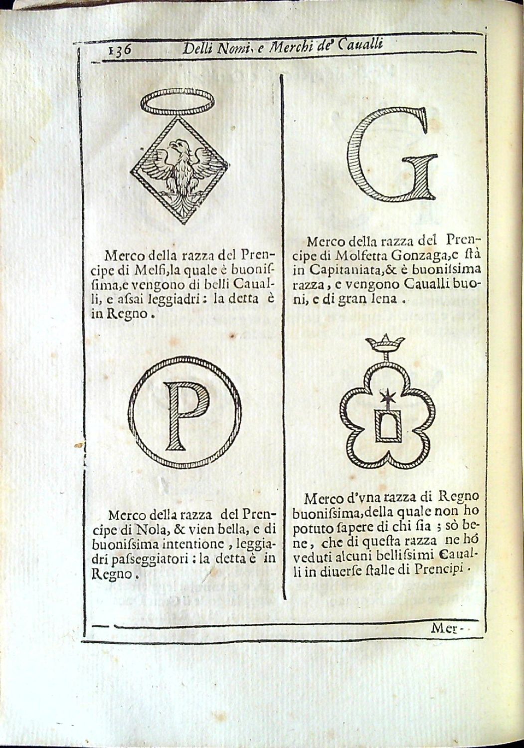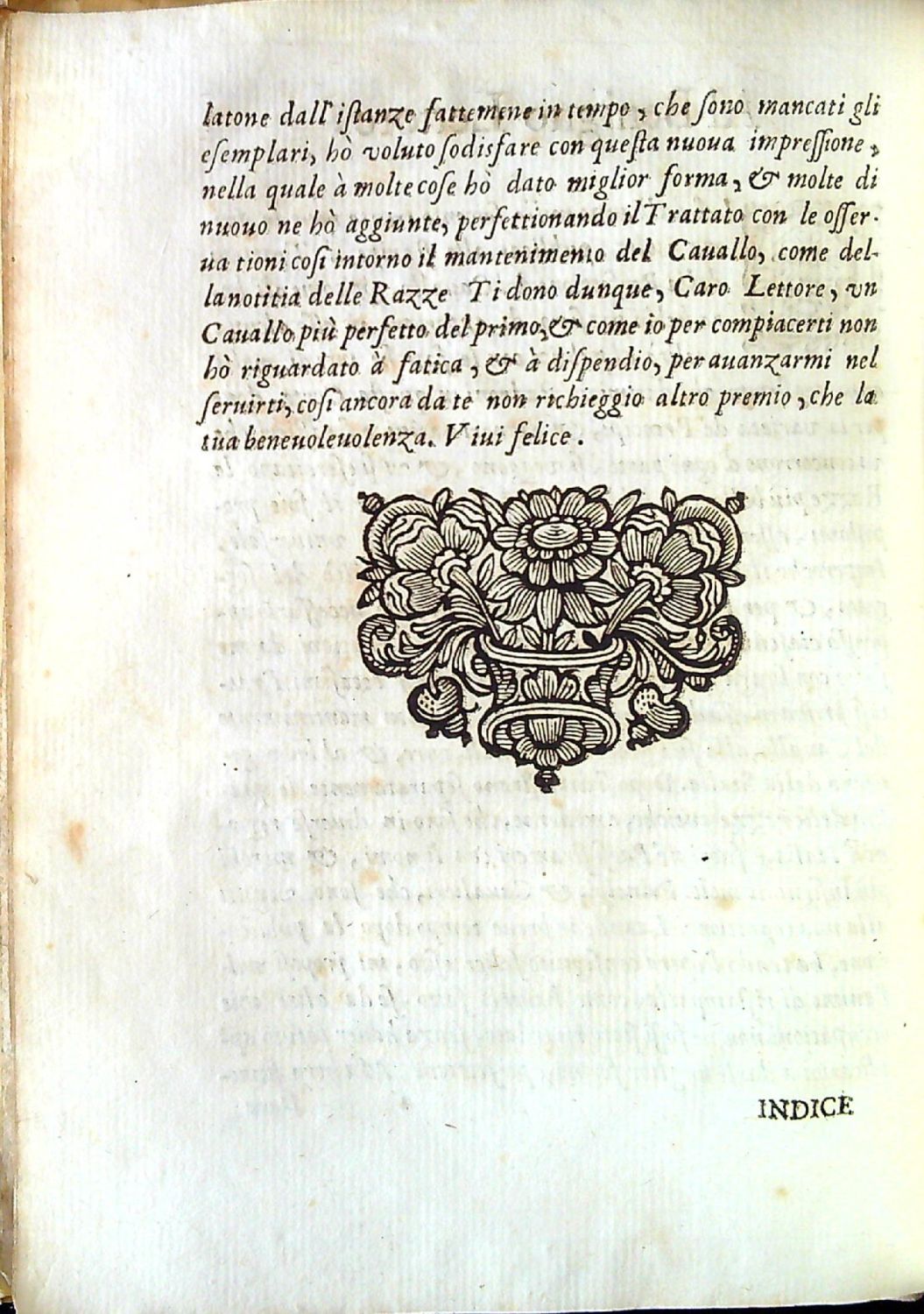 Graesse "Tresor Livrs Rares IV, 198<br>Na tit. listu erb Gio. Battisti Borghese, II. prince ze Sulmony, kterému je kniha dedikována. Konturové iniciály ve dvojitém jednoduchém rámečku na rostlinném pozadí zalomené do výše 5-6 řádků, tučně tištěné versálky ve výši 2 řádků, vstupní pásový vlys, rostlinné viněty a koncová s koněm a psem v rostlinné kompozici, na straně 133-223 celkem 355 dřevořezových vyobrazení erbů a znaků chovatelů a majitelů různých druhů koní s uvedením jejich titulů, jmen a názvů plemen jimi vlastněných.<br>Prvá část knihy pojednává o chovu koní, druhá část se zabývá jejich nemocemi a léčením a v třetí části jsou uvedeny vlastnosti starých a moderních plemen a povahy italských a zahraničních koní.<br>Dobová pergamenová vazba, ve hřbetu 5 vazů, ve druhém poli perem napsaný název. Vazba mírně zkrabatělá, při vnějším okraji odřená. Příloha při okrajích potrhaná a na rubu při vnitřním okraji pap. podlepená.