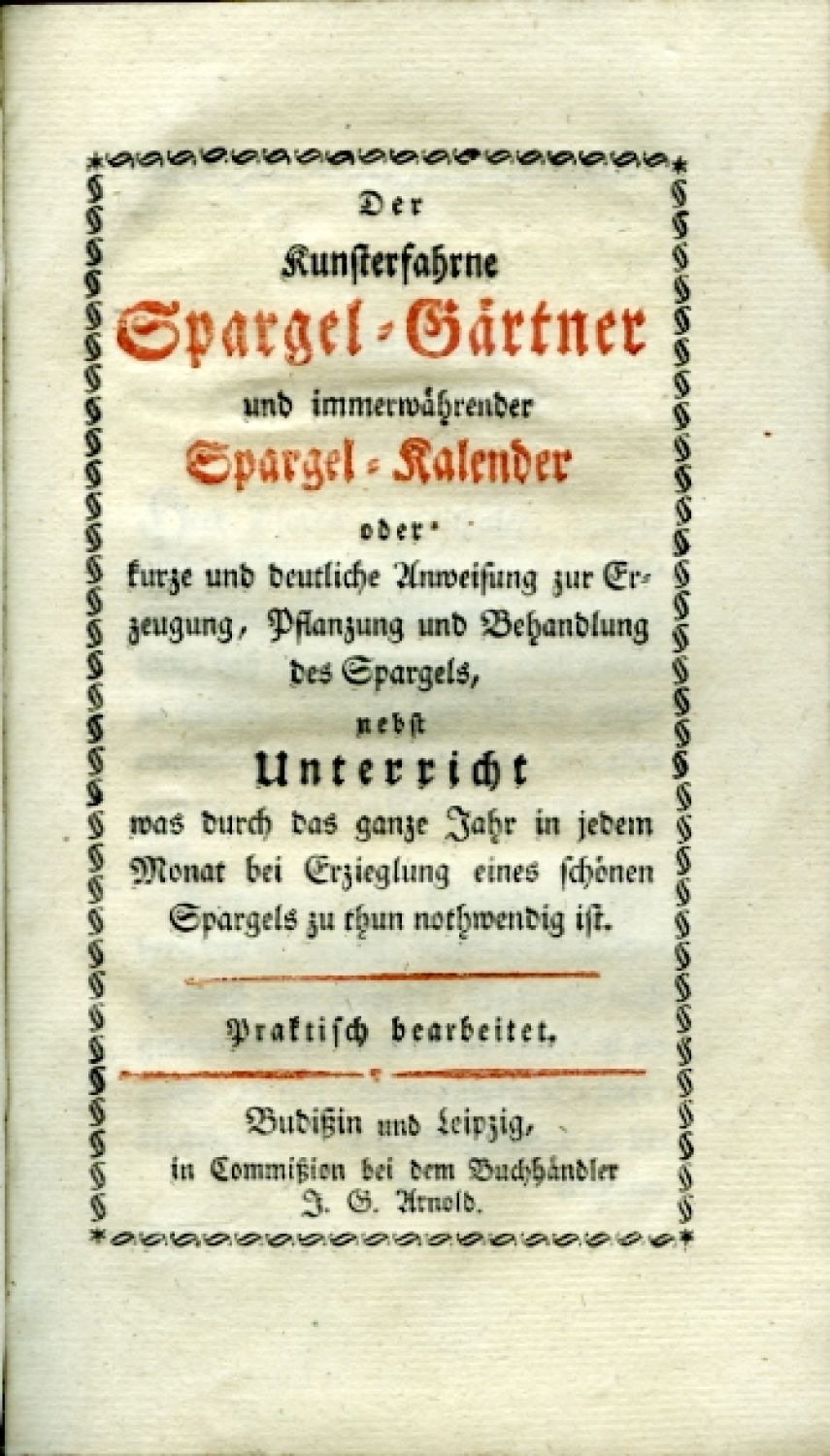 VD 18 11770619; Worldcat Cat. eviduje 2 ex. v německých knihovnách.<br>Mizící linky, uprostřed horního okraje krátká dvoulinka, latinskými číslovkami uvedená jednotlivá pravidla.<br>+ přívazek: [Engelthaler, Franz / Arnold, J. G.:] Der Kunsterfahrne Spargel=Gärtner und immerwährender Spargel=Kalender oder kurze und deutliche Anweisung zur Erzeugung, Pflanzung und Behandlung des Spargels, nebst Unterricht was durch das ganze Jahr in jedem Monat bei Erzieglung eines schönen Spargels zu thun nothwendig ist. Praktisch bearbeitet. Budißin und Leipzig, in Commißion bei dem Buchhändler J. G. Arnold, gedruckt bei E. G. Matthiä in Bauzen (Budyšín), (1795), 8°, 32 stran, červeno-černě tištěný titulní list olemovaný v rámu z paragrafů, uprostřed horního okraje stran dvojitá mizící linka, tiskař v kolofonu. - Kniha je uvedena předmluvou vydavatele (J. G. Arnolda?), ze které vyplývá, že se jedná o nové vydání knihy faráře Engelthalera "Neuer Spargelkalender" (vydané 1792 v Praze u Schönfelda), rozšířené o poznámky vydavatele. - Při horním okraji hřbetu původní kožený štítek s tlačeným a zlaceným názvem, ve spodní polovině hřbetu zelený kožený štítek s tlačenou a zlacenou ozdůbkou rostlinného charakteru. Vazba místy zkrabatělá a odřená, zlacení hřbet. štítků zčásti setřené, na hřbetě a přední desce hnědé skvrny, na vnějších okrajích listů při horních rozích průběžně menší skvrnka; přední přídeští s rkp. vlastnickým přípisem z přelomu 18. a 19. stol. "Franz Ant. Kral ...".<br>Franz Engelthaler (1750-1815) byl farářem v Oseku v Plzeňském kraji a též odborníkem v oblasti živočišné výroby. V překladu do českého jazyka vyšla též jeho kniha o chovu a nemocech ovcí v Praze roku 1800. Nabízená kniha pojednává o pěstování chřestu a obsahuje naučení, jak si v kterém měsíci v roce mají pěstitelé počínati. - VD 18 11886293-003; Worldcat Catalogue eviduje pouze 2 ex. v německých knihovnách, pražské vydání 1792 pouze v jednom ex. v Budapešti.