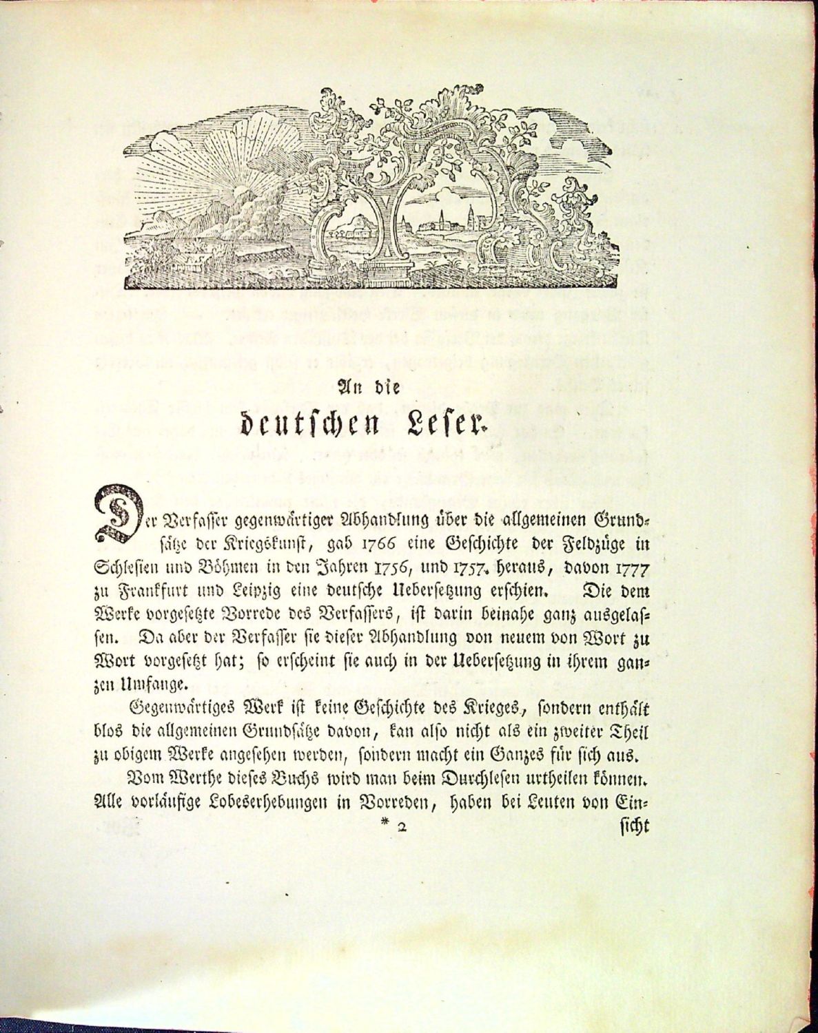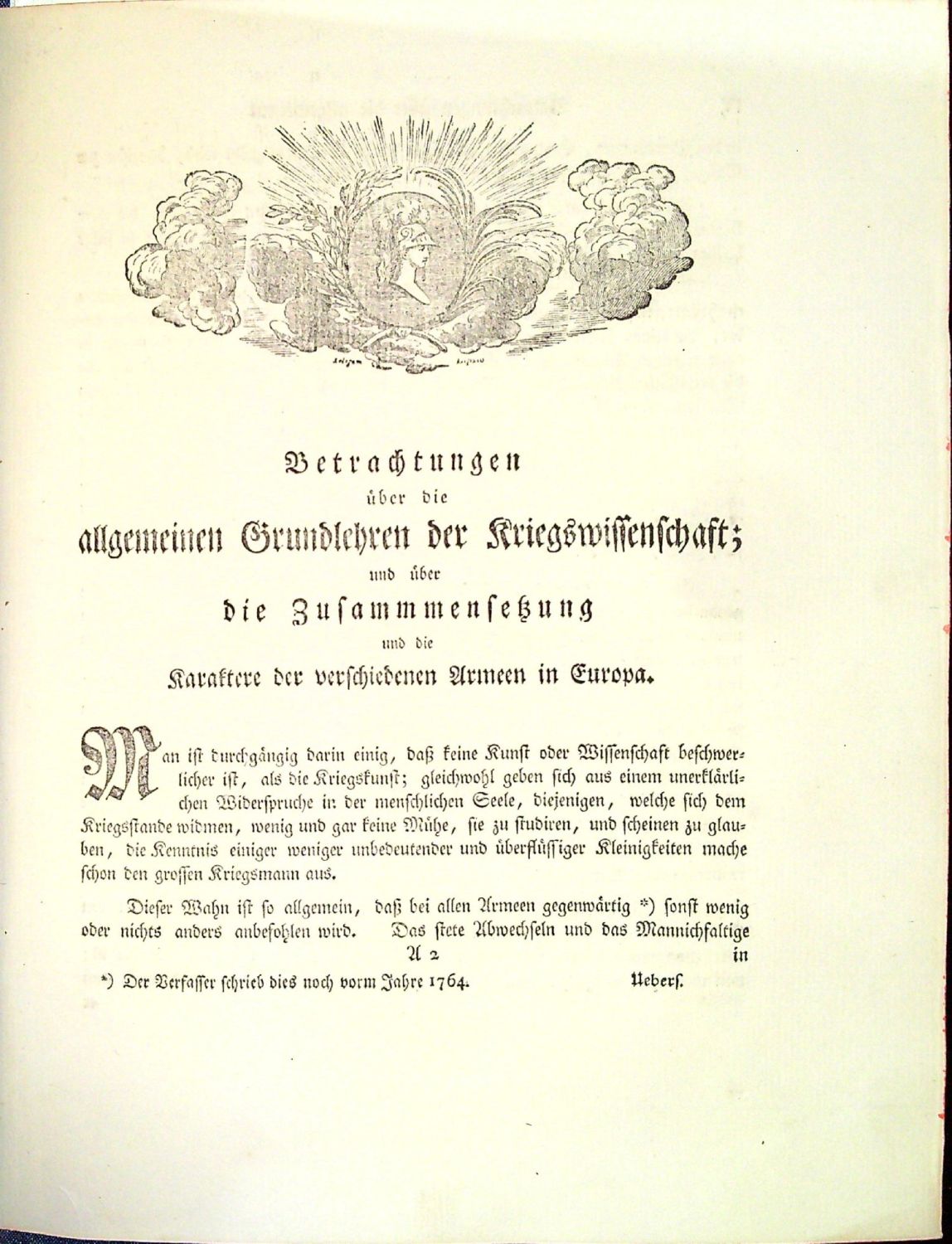 Tištěno švabachem, popisy map a řádů francouzsky antikvou, živá záhlaví. Na tit. listu viněta, dřevorytové vlysy, viněty, tučně tištěné plné iniciály ve výši 2-3 řádků. <br>Dobová kožená vazba, při horním okraji hřbetu původní kožený štítek s tlačeným názvem, červeně barvené ořízky. Vazba ohmataná a místy odřená, kůže ve hřbetu ve dvou třetinách natržená. Mapa Německa odtržená od knižního bloku.<br>Henry Lloyd, generál (1718 Wrexham - 19.6. 1783 Haag), armádní důstojník a vojenský spisovatel původem z Walesu. Během svého života bojoval na různých stranách (za Francouze proti Rakousku, jakobitské síly Karla Stuarta proti Britům, Rakušany proti Prusům, Prusy proti Rakušanů,, Rusy proti Turkům. Podnikl též různé diplomatické mise ve službách Británie. Jeho spisy o vojenské teorii studovali mimo jiné i Georg Washington a George S. Patton. Nabízená kniha vyšla poprvé v anglickém jazyce roku 1781 a je považována za jeho nejdůležitější a nejvlivnější knihu. Někteří teoretikové vojenství považovali Lloyda za "otce principů moderního válčení".