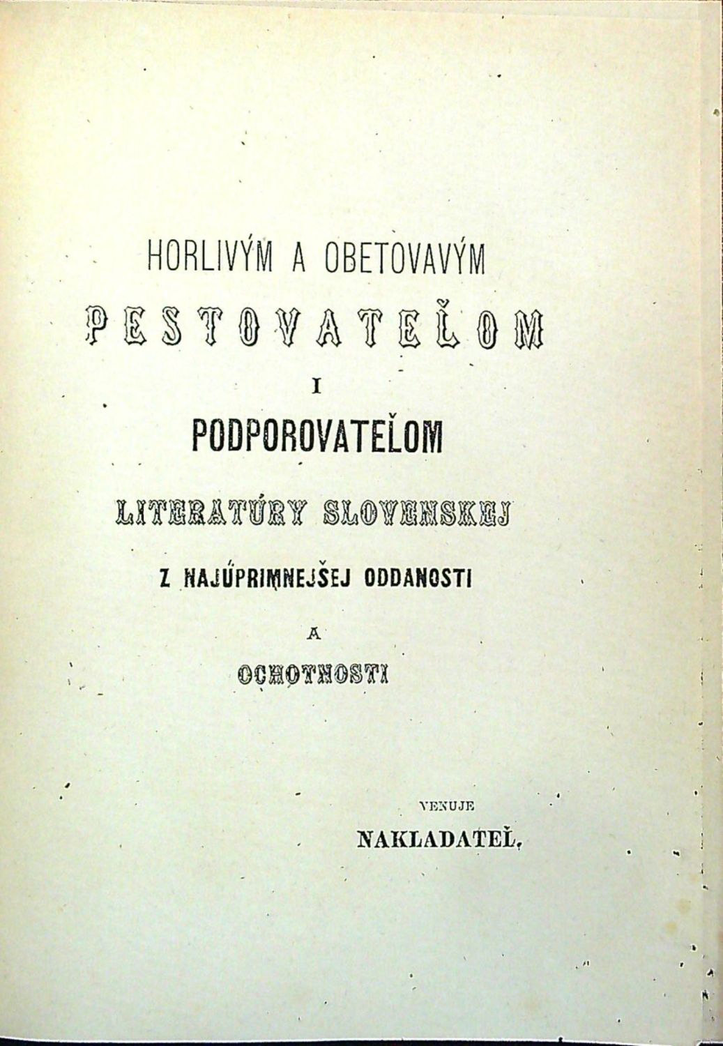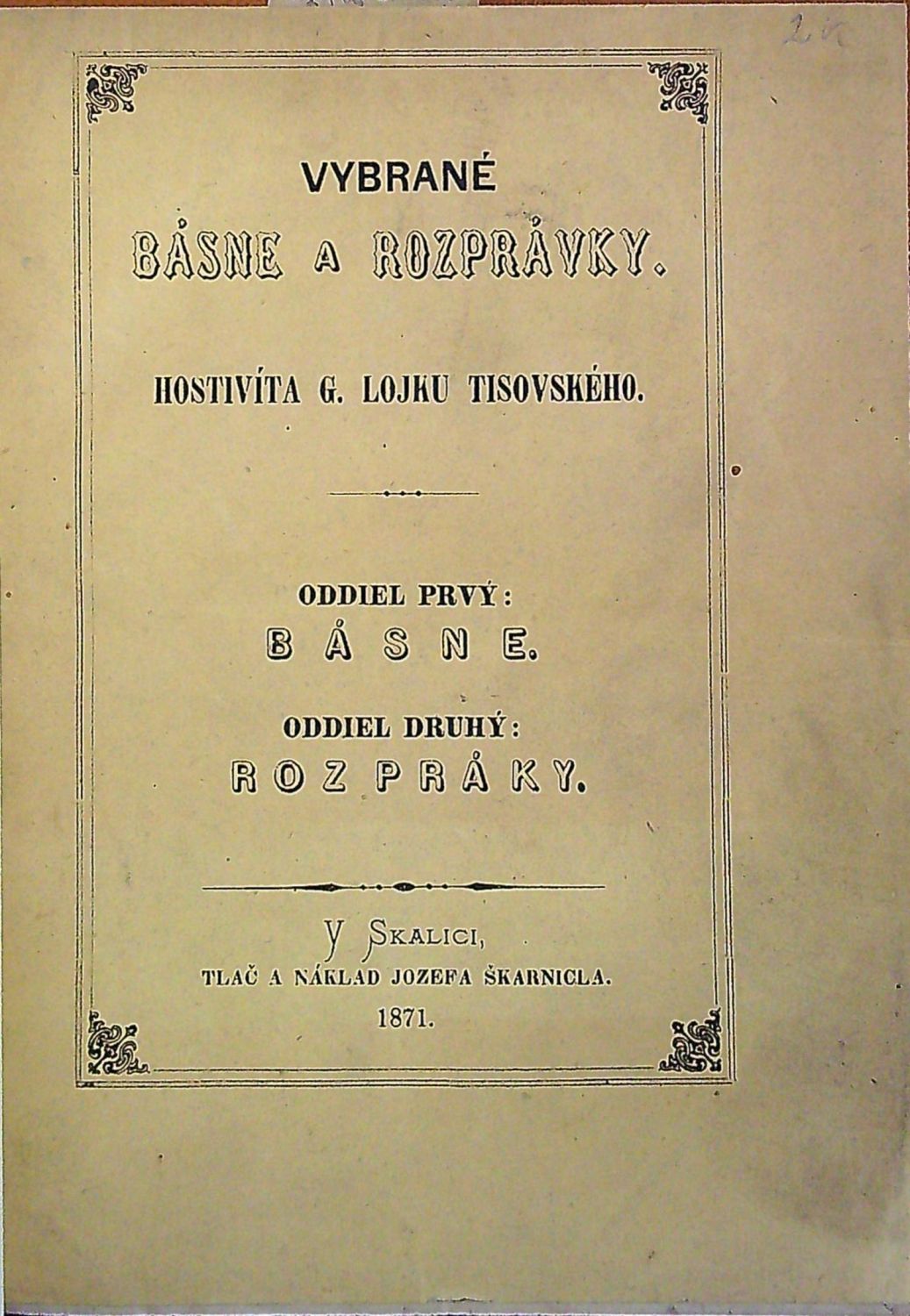 Tištěno antikvou, tučně tištěné nadpisy a plné iniciálky, dva titulní listy. Kniha vyšla jako IX. svazek "Slovensko-Národní Biblioteky".<br>Individuální polokožená vazba Otto Blažka z 30.let 20. století (na zadním přídeští vpravo dole jeho suché razítko). Kartonové desky zčásti potažené mramorovaným papírem, kožený hřbet a pokryv desek podél hřbetu, široké nárožnice (světlá hlazená vepřovice), ve hřbetu 4 vazy, při okrajích vazů ozdobné jednoduché zlacené linky, ve třech polích temně hnědé kožené štítky se jménem autora a názvy obou dílů, při spodním okraji tlačená a zlacená datace knihy, zlacená svrchní ořízka, původní pap. obálky vevázány, knižní blok neoříznutý. <br>Otto Blažek (25.4. 1906 Praha - 23.4. 1967 Praha), významný knihař a pedagog. V letech 1926-27 působil v Paříži u Théophila Stiebela, kde se přiučil technologii francouzské vazby, poté skoro dva roky působil u Pierra Legraina, ve své době nejvýznamnějšího francouzského ateliéru věnujícího se luxusní vazbě nejvyšší umělecké úrovně. <br>Gustáv Lojko, publikující pod jménem Hostivít Lojko Tisovský (4.12. 1843 Tisovec - 2.6. 1871 Revúca) básník a pedagog, od roku 1866 až do své smrti působil jako profesor na "Prvom slovenskom gymnáziu" v Revúci, kde vyučoval slovenštinu, němčinu, latinu a řečtinu.
