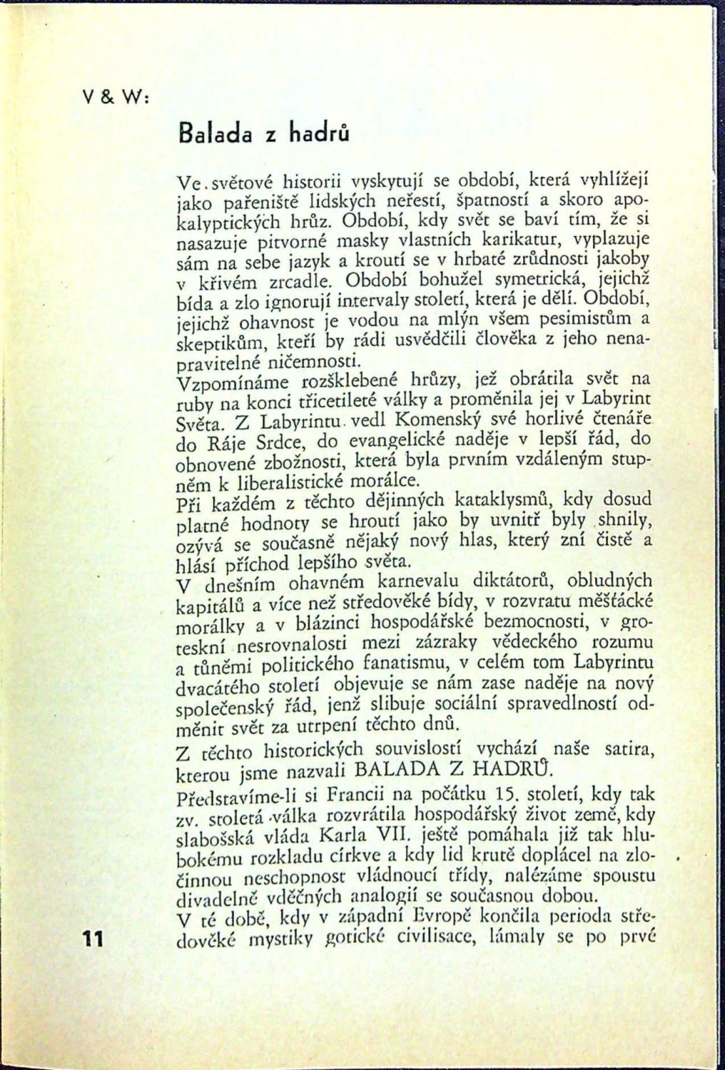 Na přední straně obálky fotograf. vyobrazení V+W ze hry Balada z hadrů, na rubu v horní části fotografie TGM z Osvobozeného divadla při jeho návštěvě představení "Svět za mřížemi", v dolní části a na zadní straně obálky fotografie z představení "Balada z hadrů". Volně vložen dvoulist s programem "Balady z hadrů".