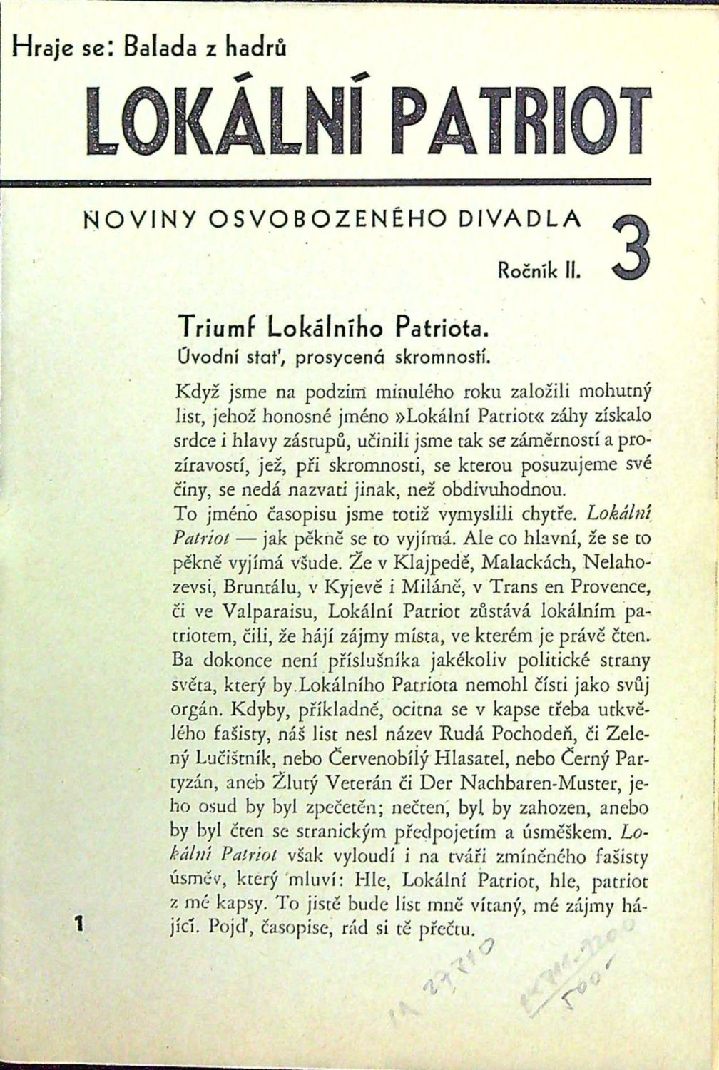 Lokální patriot. Noviny Osvobozeného divadla. Ročník II., číslo 3.