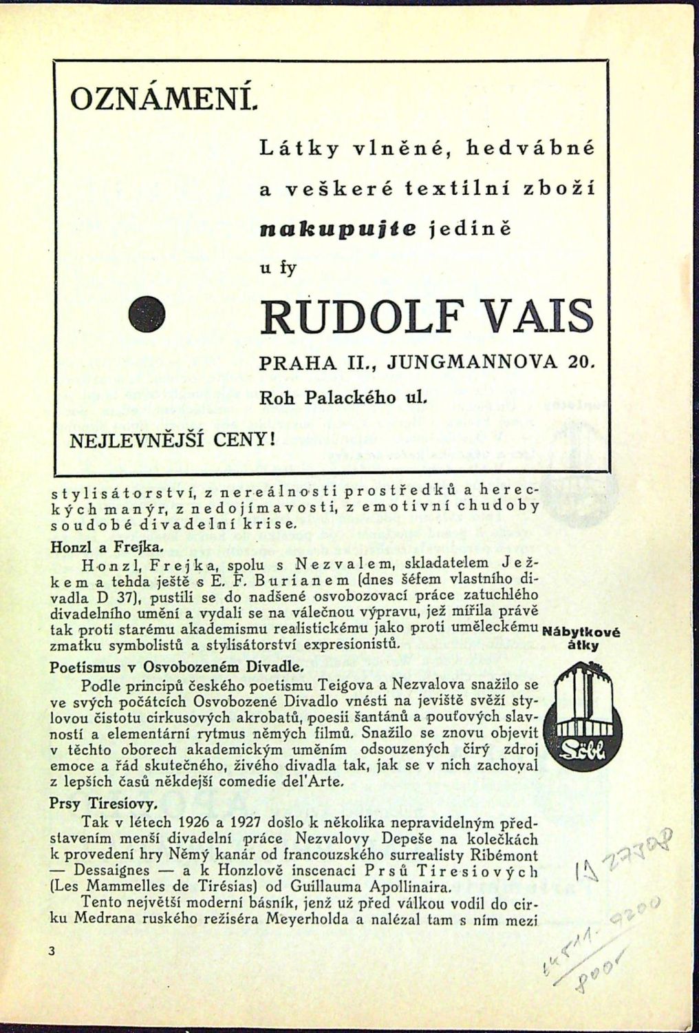 Mezi str. 16-17 (přední list) a mezi str. 24-25 (zadní list) vevázán prospekt divadla s reprodukcí kresby Fr. Zelenky. Dva dvoulisty nerozřezány. - Původní obálka s fotograf. vyobrazením V+W na přední straně a na straně zadní fotokoláž s reklamou na cigarety Egypt. Na přední straně obálky dva červené štítky s reklamou (původní adjustace) a na první straně zelené razítko s reklamou firmy Houška (ve všech exemplářích). Na straně 20 při vnějším okraji kousek štítku od reklamy, která byla přelepená přes okraj textu.