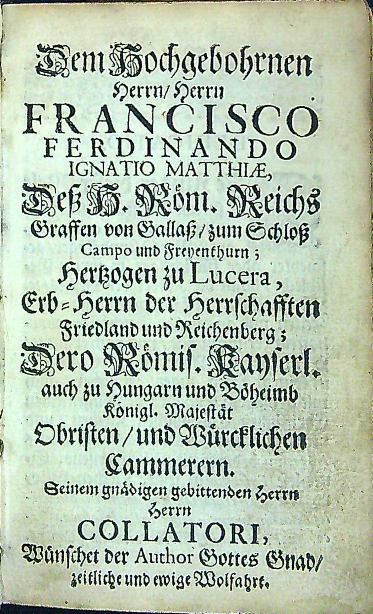 Tištěno švabachem, latinský text antikvou. Uprostřed horního okraje v kulatých závorkách mezi ozdůbkami arabská paginace stran, od sazby oddělená jednoduchou linkou. Plné iniciály propletené úponky zalomené do výše 2-4 řádků, pásové lišty z ornamentů, koncová viněta, na líci posledního listu impresum mezi ozdobnými lištami. V úvodu tištěná dedikace autorova hraběti Galassovi datovaná v Liberci 1.5. 1678.