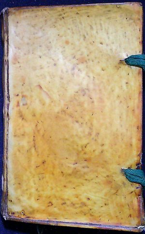 Dobová pergamenová vazba, ve hřbetu 3 vazy, na každé desce dvě novější zelené vázací tkanice. Vazba zašpiněná, místy odřená a lehce pokroucená, v textu místy světle hnědé mapky. Na titulním listu rkp. provenience z 18. století "Ex libris Patris Josephi Jonassi Hantke". - Chybí první list rejstříku (folio Q1).