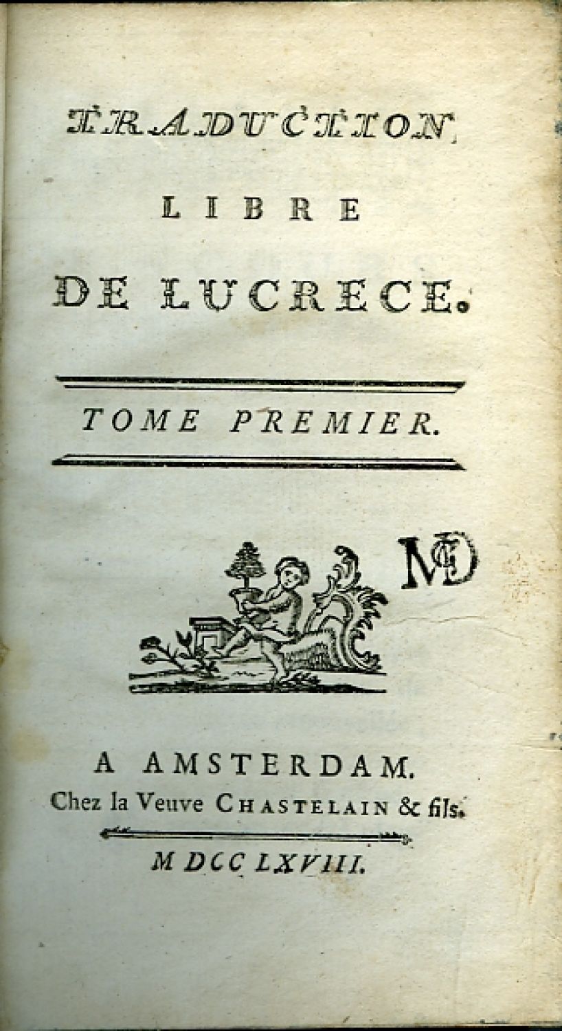 Na titulních listech viněty, v záhlavích všech šesti částí pásové vlysy. Do francouzského jazyka přeložil a úvodem opatřil Charles Joseph Panckoucke. Chyby v paginaci. <br>Dobová kožená vazba z hnědé hověziny, ve hřbetu 5 vazů, ve druhém poli tlačený a zlacený název, v ostatních polích tlačené a zlacené ozdůbky rostlinného charakteru. Vazba ohmataná, při horním okraji hřbetu lehce natržená. Stříkané ořízky. Na tit. listu prvního dílu razítko s mnogramem MD. <br>Nabízené dílo je francouzským překladem didakticko-epické Lucretiovy básně O přírodě, která se skládá ze šesti částí a objasňuje Epikurovo učení. Charles Joseph Panckoucke (1736-1798), francouzský spisovatel a nakladatel, vydával literární časopis Merkure de France a také Encyklopédie Méthodique, která navála na encyklopedii Diderotovu.