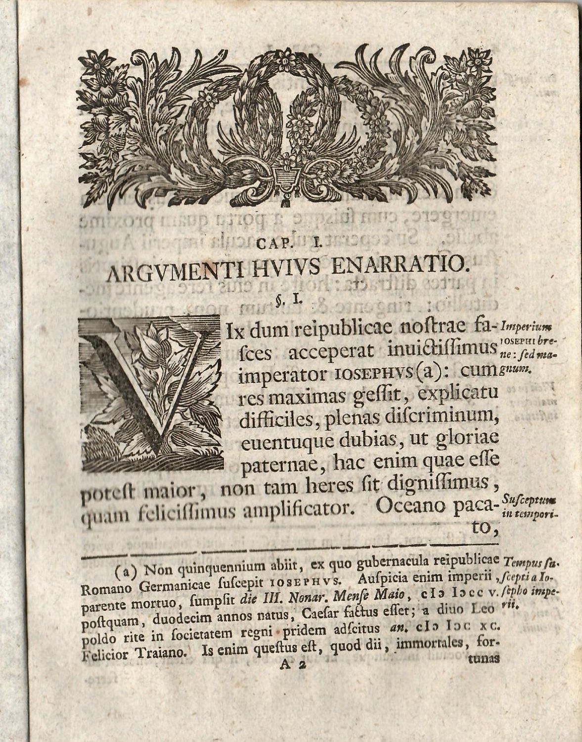 BCBT 07069<br>Tištěno antikvou, poznámky antikvovou polokurzivou, německý text švabachem, živá záhlaví od sazby oddělená jednoduchou linkou, vstupní pásový vlys květinového ornamentu se třemi věnci, vstupní konturová iniciála na rostlinném pozadí zalomená do výše 7 řádků, jednoduché linky, paragrafy, tučně tištěné versálky ve výši 2 řádků. Na straně 70 chyba v paginaci (místo 70 pag. 76). - Brožura ve hřbetu přelepená škrobovou pap. páskou.<br>Johann Peter von Ludewig (5.8. 1668 zámek Honhardt u Crailsheimu - 7.9. 1743 Halle), významný německý právník a historik. Od roku 1703 profesor historie na universitě v Halle, od roku 1704 člen královské pruské rady jako dvorní historiograf a archivář vévodství Magdeburského.