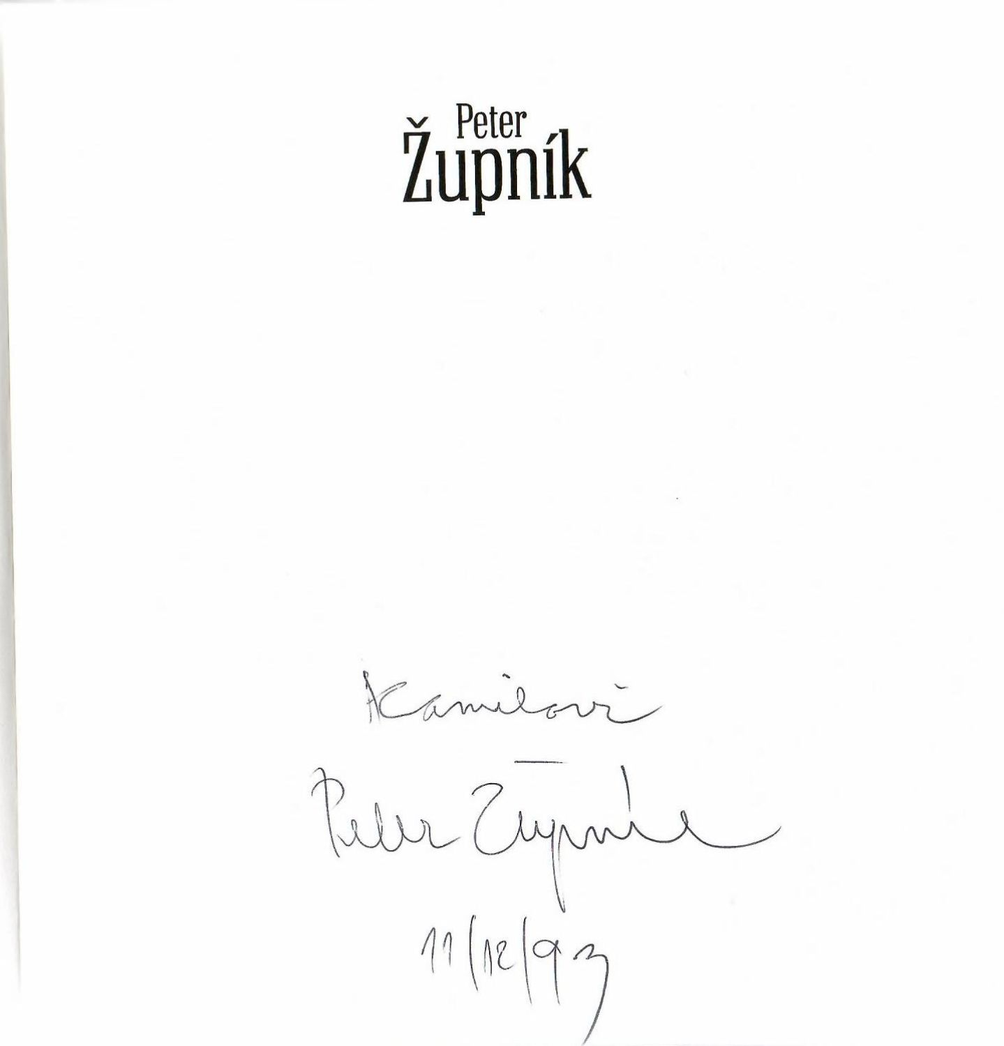 S dedikací od Petera Župníka. Text ve slovenském, anglickém, českém a francouzském jazyce. Papírová obálka při okrajích pomačkána, místy lehce natržena.