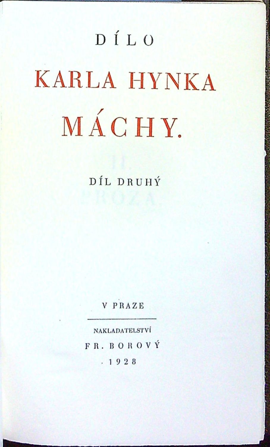 Dvoubarevně tištěný titulní list, upravil Cyril Bouda, ve front. reprodukce dvou Máchových kreseb. Text upravil a poznámkami opatřil dr. Fr. Krčma. <br>Individuální vazba z temně zelené hlazené vepřovice, na přední desce zlacený jednoduchý rám, uvnitř rámu červená iniciála Máchova příjmení, ve hřbetu tlačený a zlacený název, zlacená svrchní ořízka. Hřbet následkem slunečních paprsků vyšisovaný, ochranné kartonové pouzdro. Přední strana původní pap. obálky přivázána. Poslední dva listy s údaji o tisku v horní třetině uvolněny od knižního bloku.
