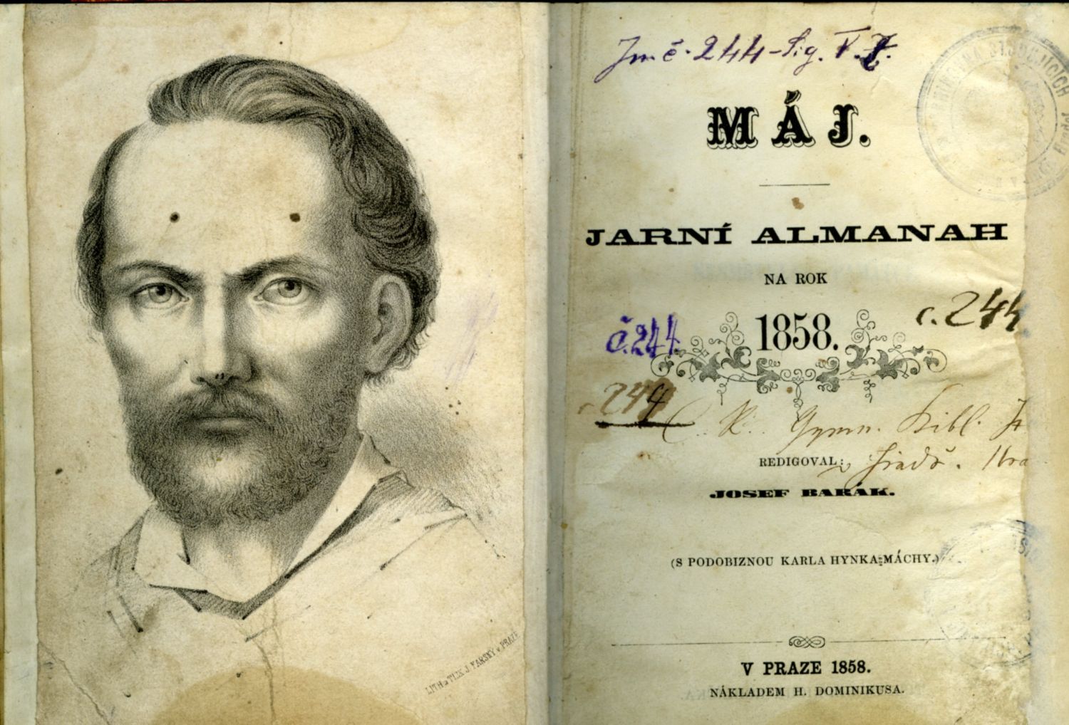 Hřbet přelepen knihovnickým štítkem, na předsádkách a tit. listu (zde i rkp. knihovnické signatury) razítko, listy ohmatané, okraje frontispisu, titulu a dalších dvou listů podlepené. - Literární sborník Máj sestavený Janem Nerudou a Vítězslavem Hálkem (jako redaktor uveden publicista Josef Barák) byl vydán 1. května 1858. Básněmi nebo menšími prozaickými díly do něj vedle Nerudy, Hálka a Baráka dále přispěli K. Světlá, A. Heyduk, Rudolf Mayer, J. V. Frič (pod pseudonymem M. Brodský) a jeho manželka píšící pod pseudonymem Anna Sázavská, K. J. Erben (uveden jako J. E. Miletínský), Sofie Podlipská (podepsána křestním jménem Žofie), B. Němcová, Bohumil Janda Cidlinský (pod pseudonymem V. Lánský), K. Sabina (podepsán iniciálami) a Jan Palacký. Generace poloviny 19. století, "májovci" se tak názvem svazku přihlásila ke K. H. Máchovi jako k básníku, který měl největší odvahu bořit konvenční představy o povaze a funkci tzv. národního básnictví. Tvůrci almanachu čelili útokům konzervativní kritiky pro svůj údajný kosmopolitismus, výtky z nedostatku národního cítění ale vyvrátili.