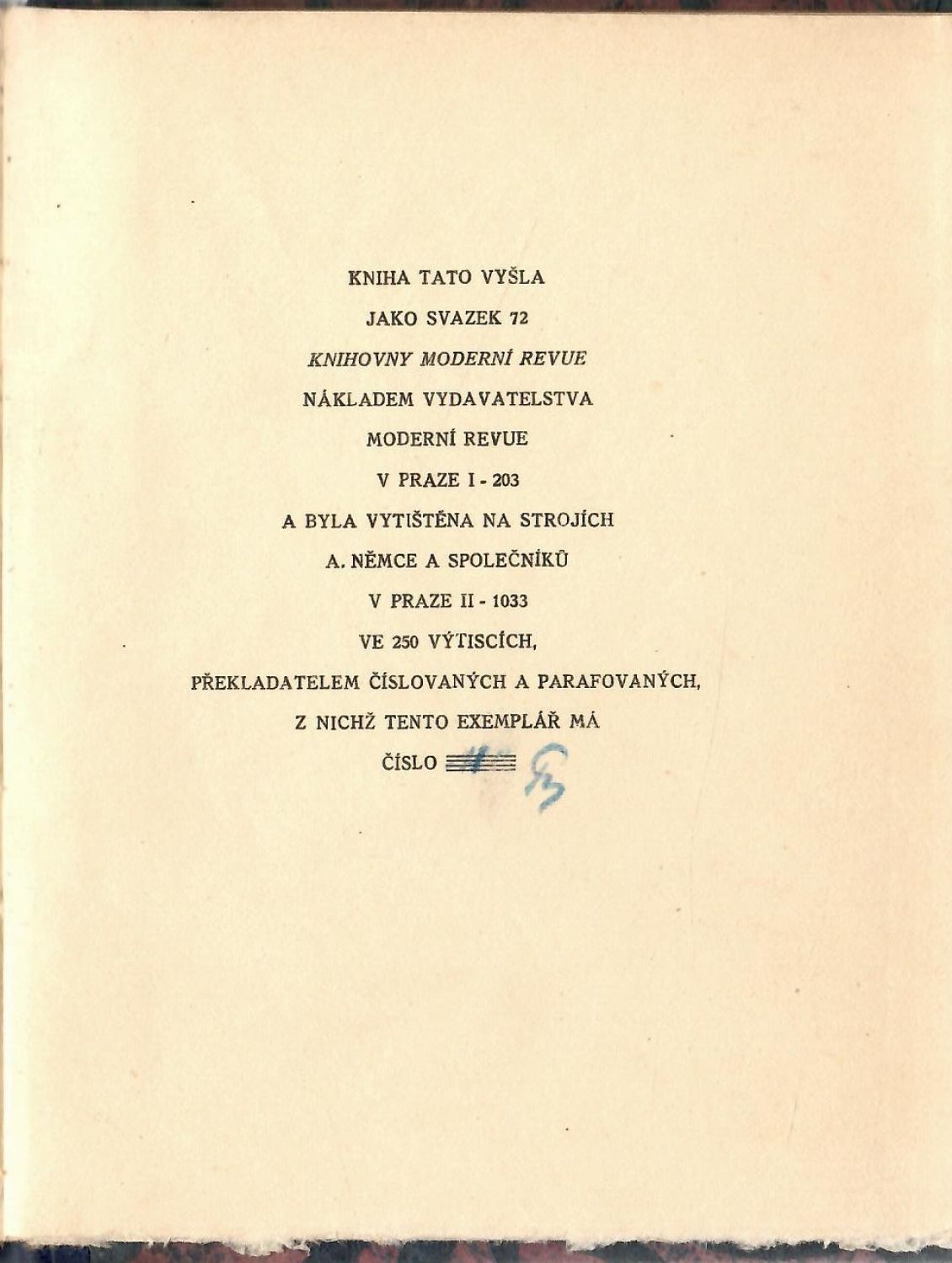 Ex. č. 18 z 250 vydaných. Dobová polokožená převazba. Hřbet při horním i spodním okraji mírně podřen, jinak velmi dobrý stav.