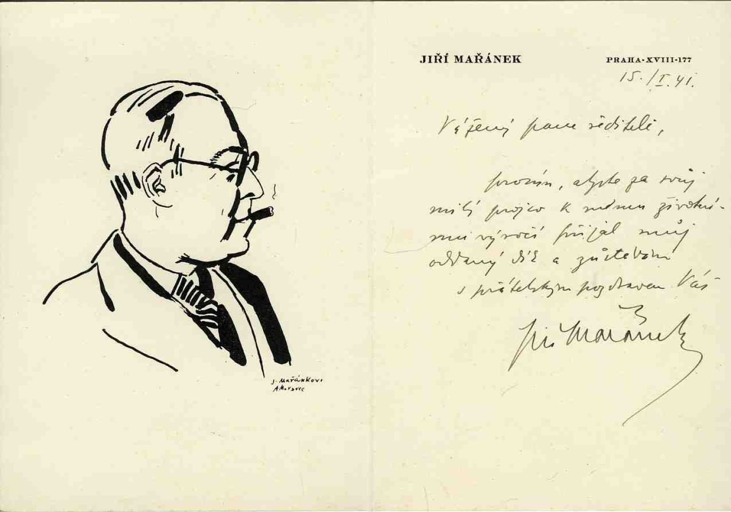 Dvoulist kartonu 15 x 11 cm, na rubu levé části reprodukce Mařánkova kresleného portrétu od A. Moravce, v pravé části tištěné záhlaví se jménem, pod nímž psaáno černým inkoustem, datováno 15.I.41. - Jiří Mařánek (1891–1959), spisovatel, autor poetických próz, historických románů a scenárista.