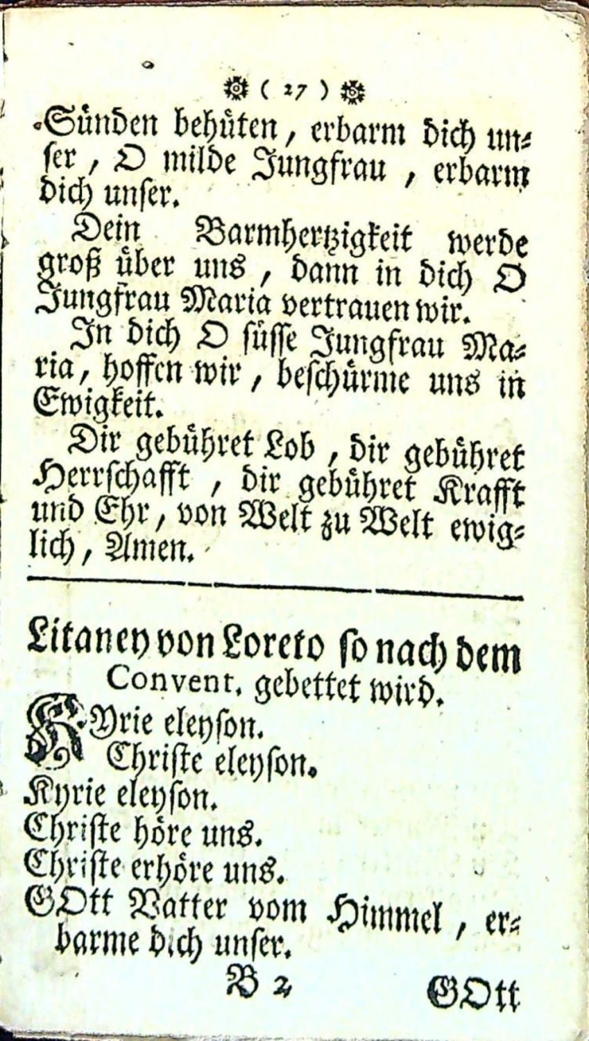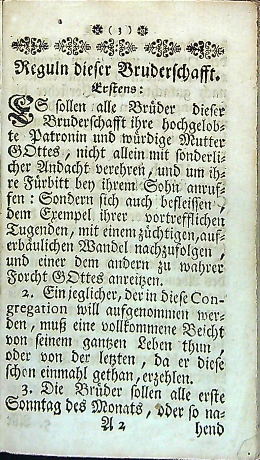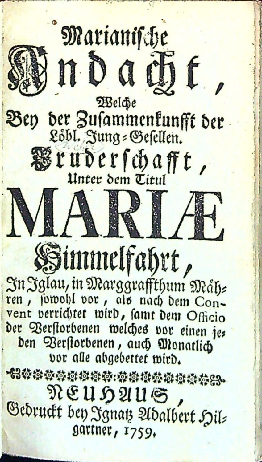 Marianische Andacht, Welche Bey der Zusammenkunsst der Löbl. Jung=Gesellen. Brudeschafft, Unter dem Titul MARIAE Himmelfahrt, In Iglau, in Marggraffthum Mähren, sowohl vor, als nach dem Convent verrichtet wird, samt dem Officio der Verstorbenen welches vor einen jeden Verstorbenen, auch Monatlich vor alle abgebettet wird.